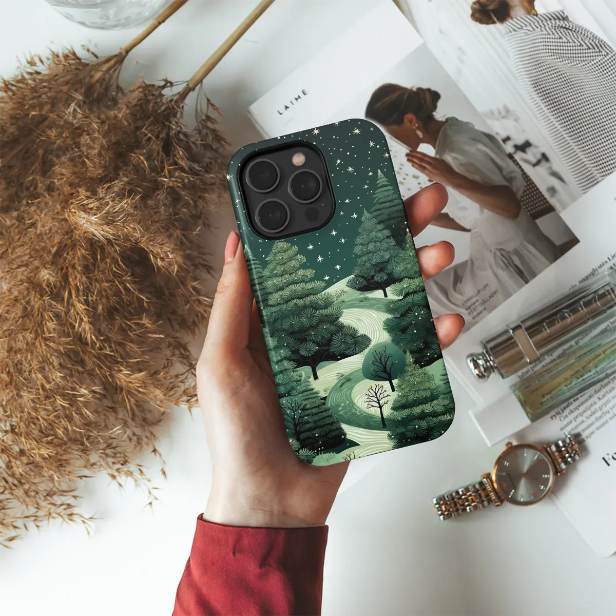 Wander into a tranquil forest under a canopy of twinkling stars with this enchanting design. Imagine the crisp, silent air of a deep winter's night, where a winding path of fresh snow invites you on a peaceful journey through rolling, moonlit hills. Majestic evergreen and pine trees, rendered in rich shades of emerald and forest green, stand as silent guardians against a vast, star-dusted sky. Each stylized star and delicate snowflake captures the serene magic of the season, creating a moment of pure tranquility. This beautiful linocut-inspired artwork evokes the cozy feeling of the holiday season and the quiet solitude of nature, blending a rustic forestcore aesthetic with a touch of whimsical wonder. It's the perfect daily escape for the nature lover, the stargazer, and anyone who finds solace in the untamed beauty of a starlit wilderness. Let this miniature masterpiece transform your essential accessory into a pocket-sized piece of art, a unique statement of your love for the great outdoors. It's a thoughtful gift for her, for him, or for anyone who cherishes the calm and natural elegance of the winter season. Carry this enchanting scene with you and let its peaceful charm inspire your day.
