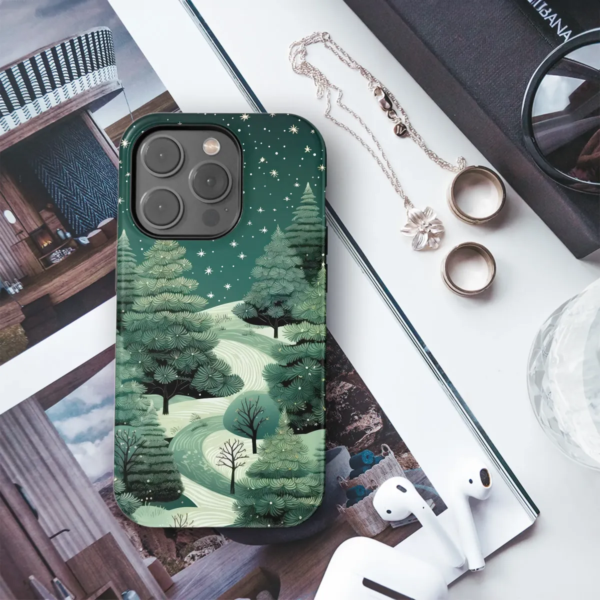 Wander into a tranquil forest under a canopy of twinkling stars with this enchanting design. Imagine the crisp, silent air of a deep winter's night, where a winding path of fresh snow invites you on a peaceful journey through rolling, moonlit hills. Majestic evergreen and pine trees, rendered in rich shades of emerald and forest green, stand as silent guardians against a vast, star-dusted sky. Each stylized star and delicate snowflake captures the serene magic of the season, creating a moment of pure tranquility. This beautiful linocut-inspired artwork evokes the cozy feeling of the holiday season and the quiet solitude of nature, blending a rustic forestcore aesthetic with a touch of whimsical wonder. It's the perfect daily escape for the nature lover, the stargazer, and anyone who finds solace in the untamed beauty of a starlit wilderness. Let this miniature masterpiece transform your essential accessory into a pocket-sized piece of art, a unique statement of your love for the great outdoors. It's a thoughtful gift for her, for him, or for anyone who cherishes the calm and natural elegance of the winter season. Carry this enchanting scene with you and let its peaceful charm inspire your day.
