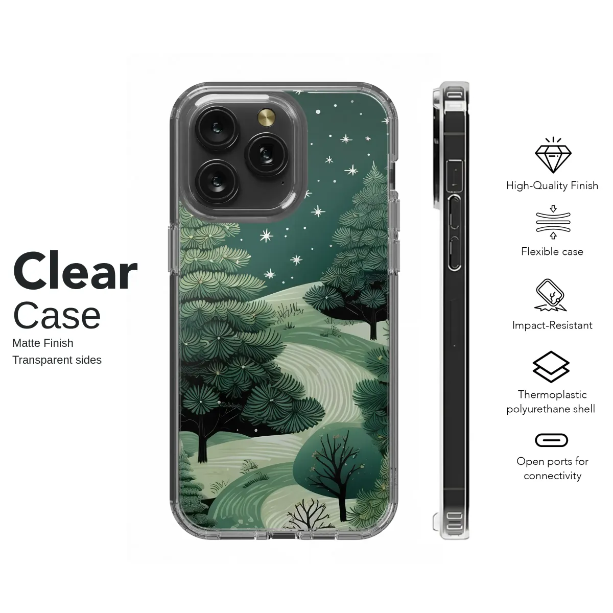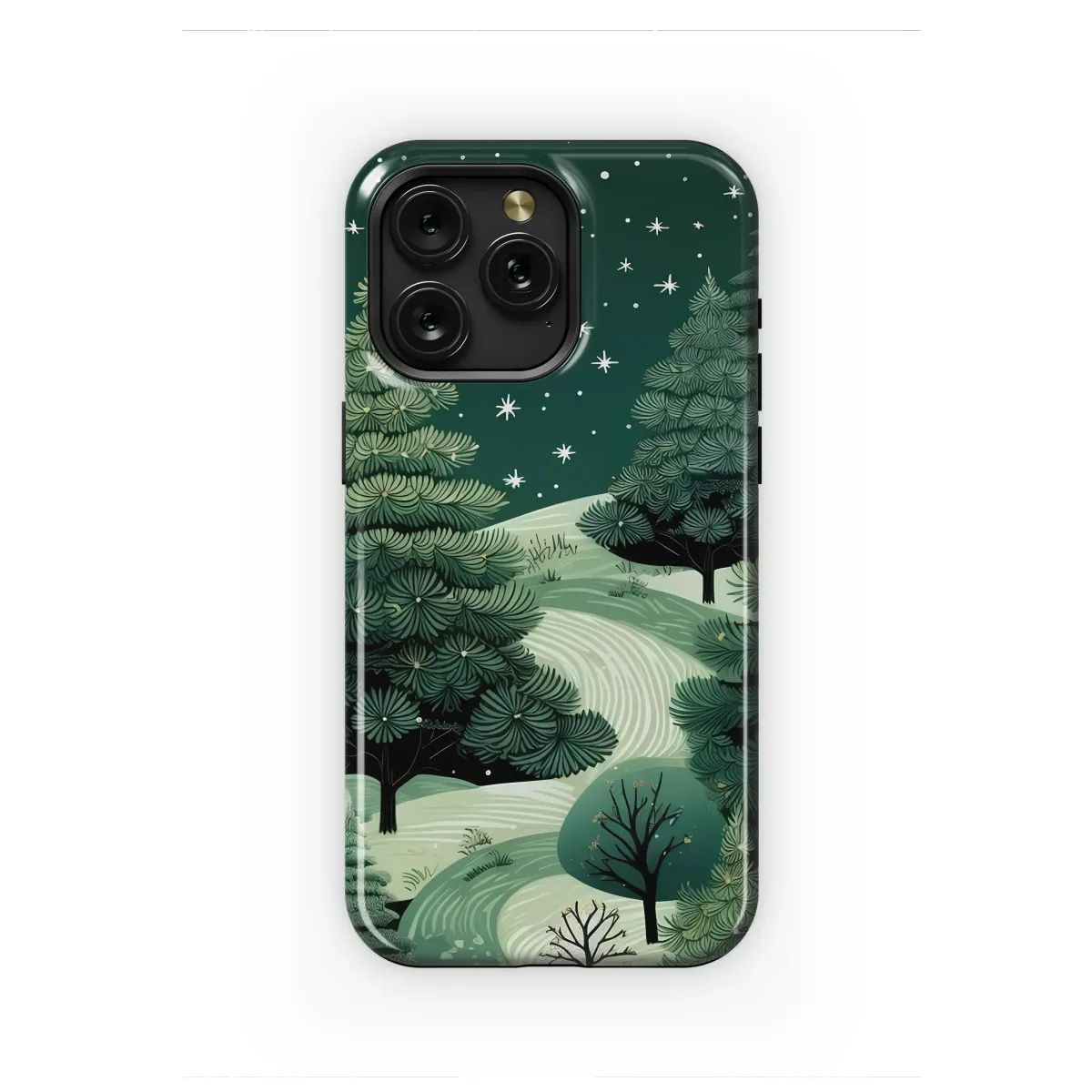 Wander into a tranquil forest under a canopy of twinkling stars with this enchanting design. Imagine the crisp, silent air of a deep winter's night, where a winding path of fresh snow invites you on a peaceful journey through rolling, moonlit hills. Majestic evergreen and pine trees, rendered in rich shades of emerald and forest green, stand as silent guardians against a vast, star-dusted sky. Each stylized star and delicate snowflake captures the serene magic of the season, creating a moment of pure tranquility. This beautiful linocut-inspired artwork evokes the cozy feeling of the holiday season and the quiet solitude of nature, blending a rustic forestcore aesthetic with a touch of whimsical wonder. It's the perfect daily escape for the nature lover, the stargazer, and anyone who finds solace in the untamed beauty of a starlit wilderness. Let this miniature masterpiece transform your essential accessory into a pocket-sized piece of art, a unique statement of your love for the great outdoors. It's a thoughtful gift for her, for him, or for anyone who cherishes the calm and natural elegance of the winter season. Carry this enchanting scene with you and let its peaceful charm inspire your day.