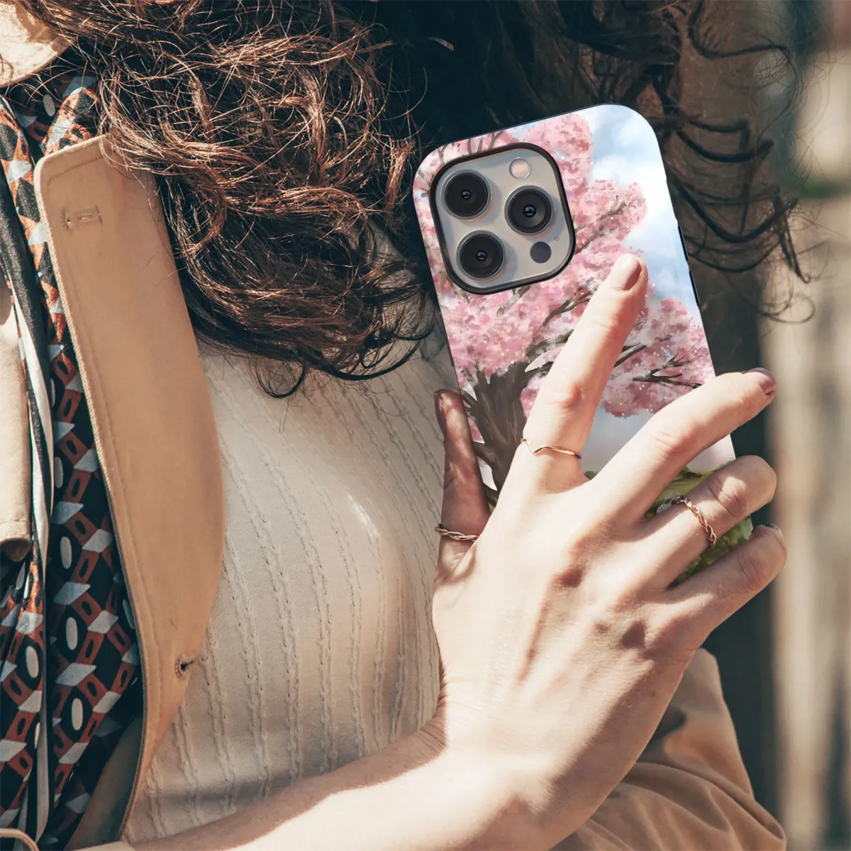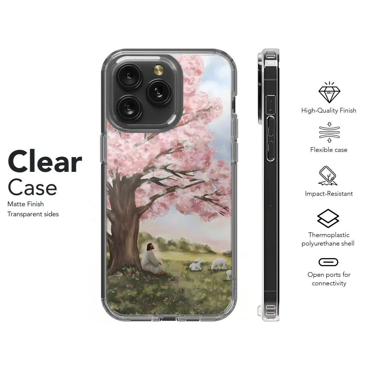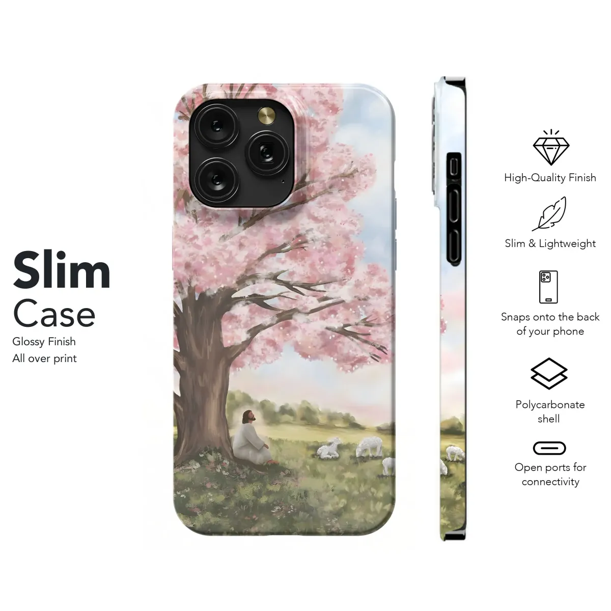 Wrap your device in the serenity of this pastoral scene, a heartwarming artwork depicting a peaceful moment of contemplation under a blossoming tree. The gentle pink hues of the flowering branches create a tranquil canopy, casting a soft light upon the verdant meadow where sheep graze contentedly. This evocative imagery brings a touch of spiritual grace and natural beauty to your everyday carry, serving as a constant reminder of peace and reflection. Perfect for anyone seeking a touch of faith-inspired art and pastoral charm, this design transforms a functional item into a personal statement of belief and appreciation for nature's simple joys. The high-quality print ensures vibrant colors and lasting detail, making it a cherished accessory or a thoughtful gift for loved ones. Ideal for Christian gifts, religious art, spiritual decor, nature lovers, or anyone seeking a daily dose of inspiration. This item provides a stylish way to showcase your faith and bring a peaceful landscape to life.