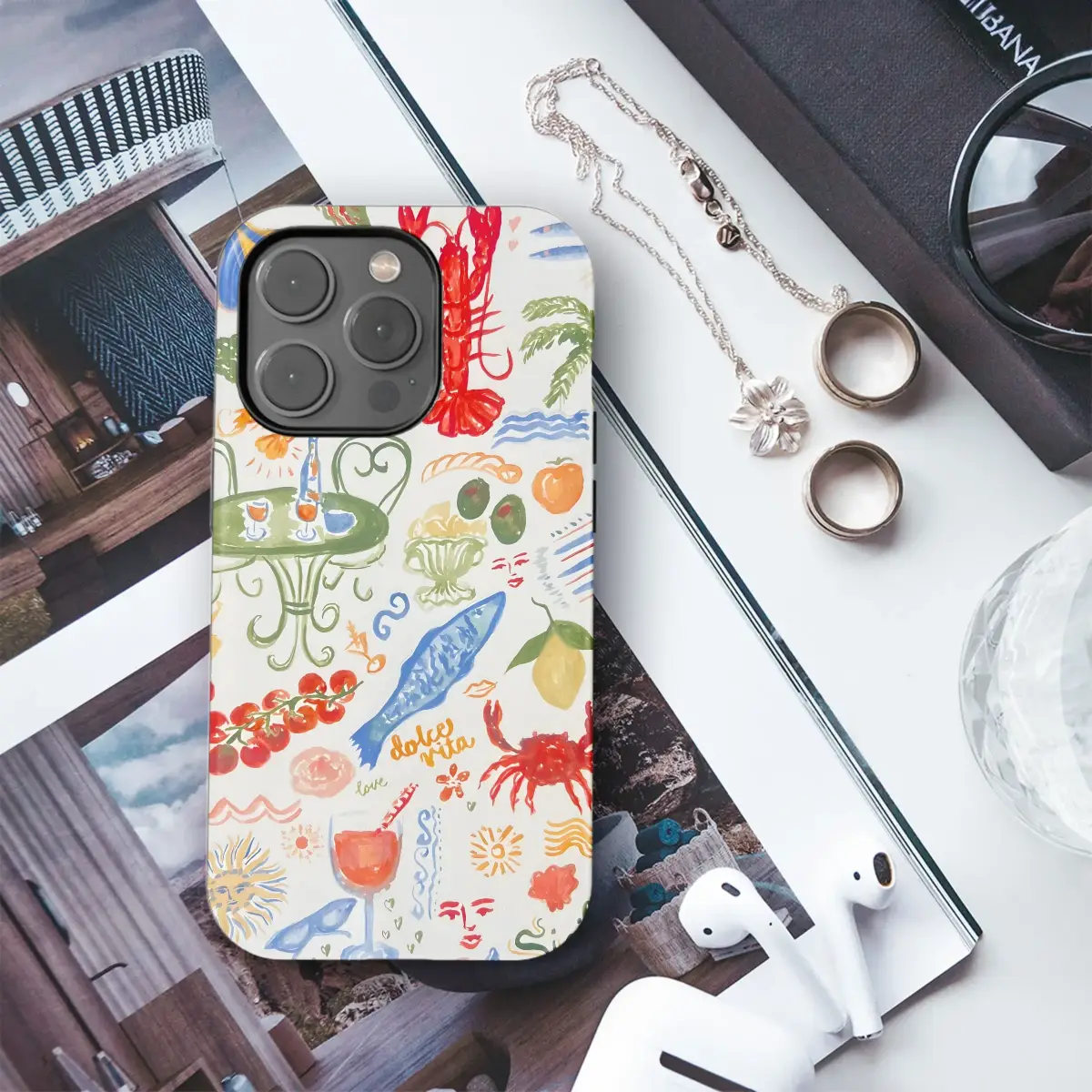 Immerse yourself in the vibrant charm of the Italian coast with this delightful, hand-painted style illustration, capturing the essence of a Sicilian summer day. This artistic print features a lively medley of Mediterranean delights and symbols of 'dolce vita'. Discover beautifully rendered illustrations of fresh seafood like bright red lobster, plump crab, delicious fish, succulent shrimp, and briny oysters, alongside ripe tomatoes, green olives, and zesty lemons. The scene includes a charming al fresco dining setup with a table, chairs, umbrella, and wine, inviting you to savor the moment. Iconic coastal elements like sunny skies, rolling waves, and swaying palm trees are scattered throughout, creating a truly transportive visual experience. Whimsical details such as sunglasses, hearts, stylized faces, and playful text like "menu", "love", "familia", and "Sicily" add a personal touch and narrative depth. The watercolor style brings a touch of vintage artistry, making this design a unique statement piece. Perfect for anyone who loves Italian culture, gourmet food, summer travel, or simply appreciates vibrant, original artwork. Carry a slice of Mediterranean sunshine and joyful moments wherever you go with this unique printed accessory, a fantastic way to add a splash of color and a touch of wanderlust to your daily essentials. Celebrate the good life, delicious flavors, and cherished connections with this enchanting, artful illustration that brings the warmth and taste of Italy right to your fingertips. This colorful pattern is more than just a design; it's a mini-vacation for your senses, capturing the spirit of coastal living and the simple pleasures of good food and company, a truly special artistic item for unique style.