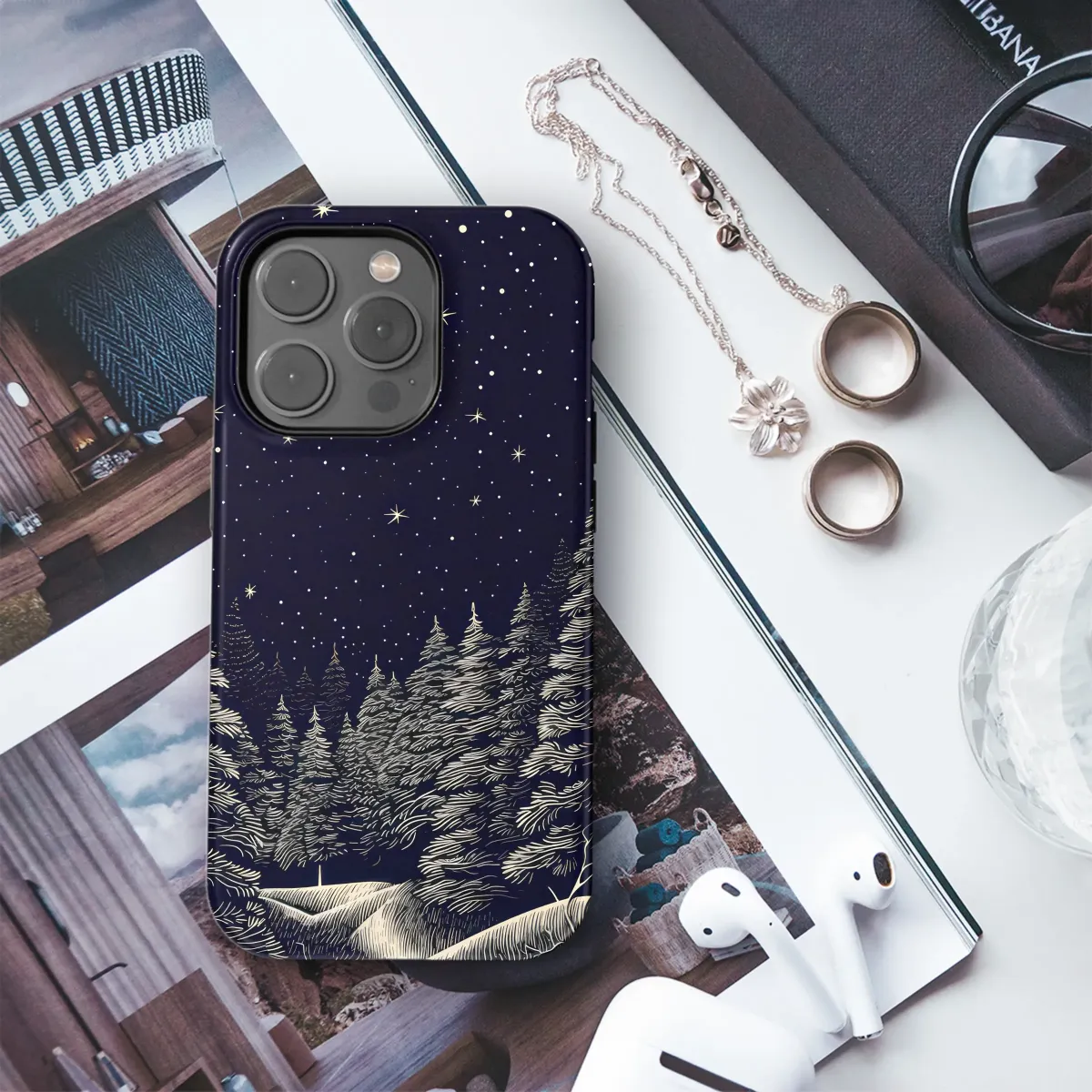 Step into a world of silent wonder with this breathtaking Starry Winter Night design, a captivating piece of art for your everyday companion. Imagine standing in a quiet forest clearing, the crisp winter air filling your lungs as you gaze up at a vast, ink-black sky. Around you, ancient pines stand tall, their branches gracefully dusted in moonlight, their intricate silhouettes reaching for the heavens. Above, a brilliant tapestry of stars and distant constellations twinkles with a pure, celestial light, each one a tiny beacon in the immense cosmic dark. This artwork masterfully captures that serene, magical moment in a stunning woodcut-inspired style, where bold, flowing lines create a mesmerizing, high-contrast dance between the dark expanse and the glowing celestial bodies. It’s more than just a beautiful image; it's a portable escape to a peaceful, frost-kissed wilderness. Let this enchanting forest scene adorn your most-used accessory, transforming it into a personal piece of art that carries the quiet magic of a starlit winter's eve wherever you go. It makes a perfect, thoughtful gift for the stargazer, the forest wanderer, or anyone who finds solace in the quiet beauty of the natural world. Wrap your device in the magic of a celestial winter night and hold a universe of peace right in your hands.