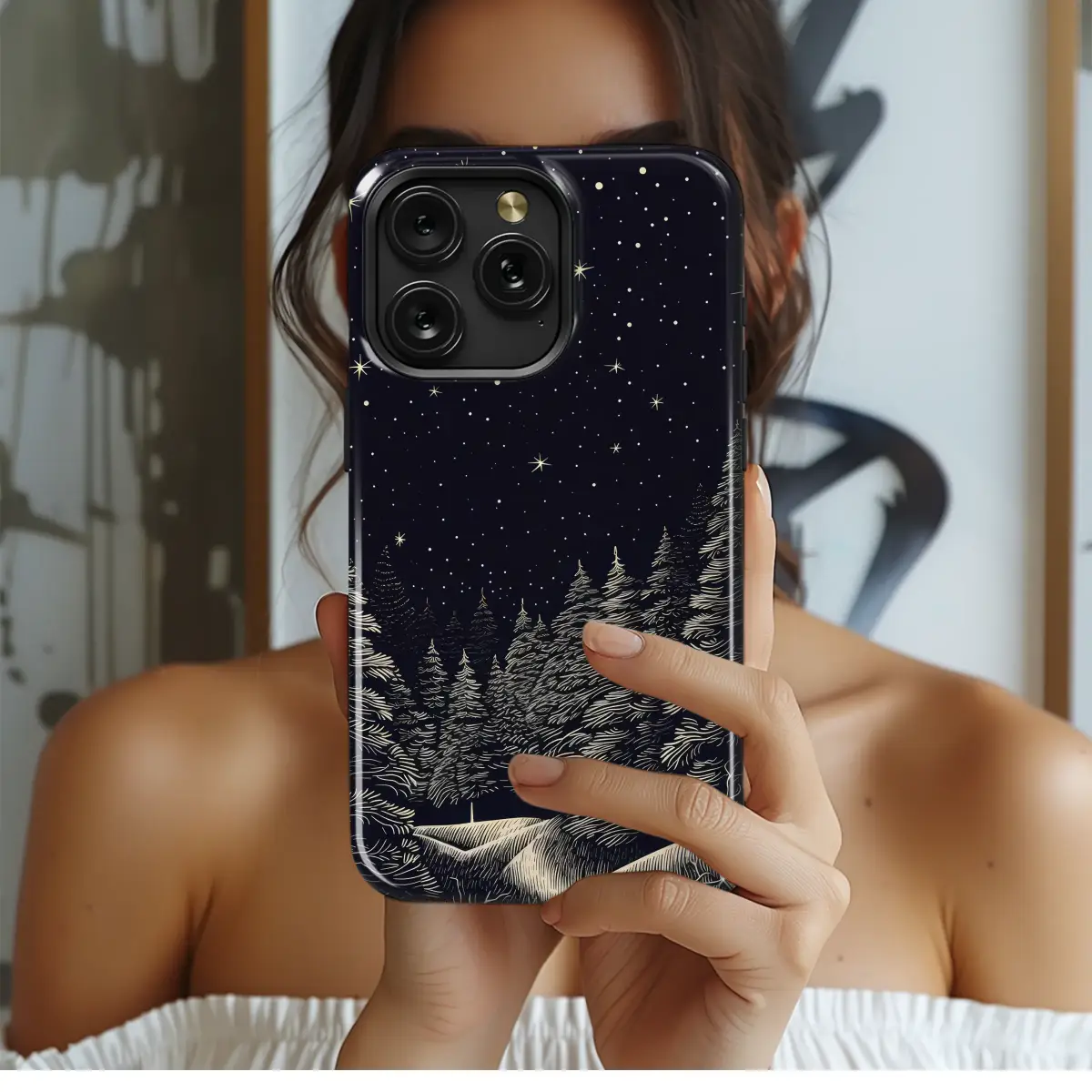 Step into a world of silent wonder with this breathtaking Starry Winter Night design, a captivating piece of art for your everyday companion. Imagine standing in a quiet forest clearing, the crisp winter air filling your lungs as you gaze up at a vast, ink-black sky. Around you, ancient pines stand tall, their branches gracefully dusted in moonlight, their intricate silhouettes reaching for the heavens. Above, a brilliant tapestry of stars and distant constellations twinkles with a pure, celestial light, each one a tiny beacon in the immense cosmic dark. This artwork masterfully captures that serene, magical moment in a stunning woodcut-inspired style, where bold, flowing lines create a mesmerizing, high-contrast dance between the dark expanse and the glowing celestial bodies. It’s more than just a beautiful image; it's a portable escape to a peaceful, frost-kissed wilderness. Let this enchanting forest scene adorn your most-used accessory, transforming it into a personal piece of art that carries the quiet magic of a starlit winter's eve wherever you go. It makes a perfect, thoughtful gift for the stargazer, the forest wanderer, or anyone who finds solace in the quiet beauty of the natural world. Wrap your device in the magic of a celestial winter night and hold a universe of peace right in your hands.