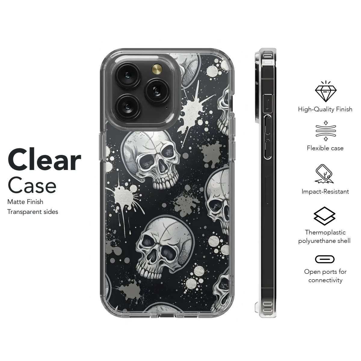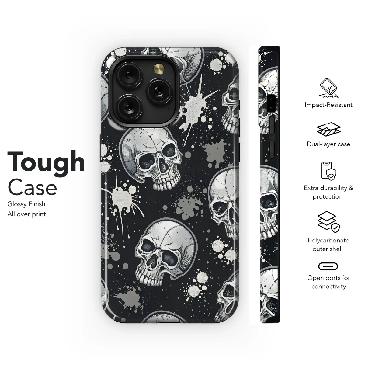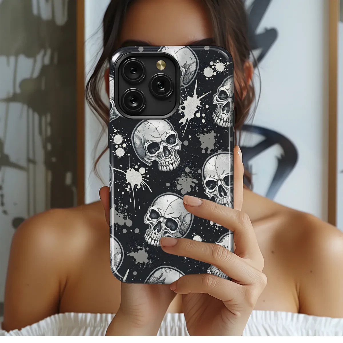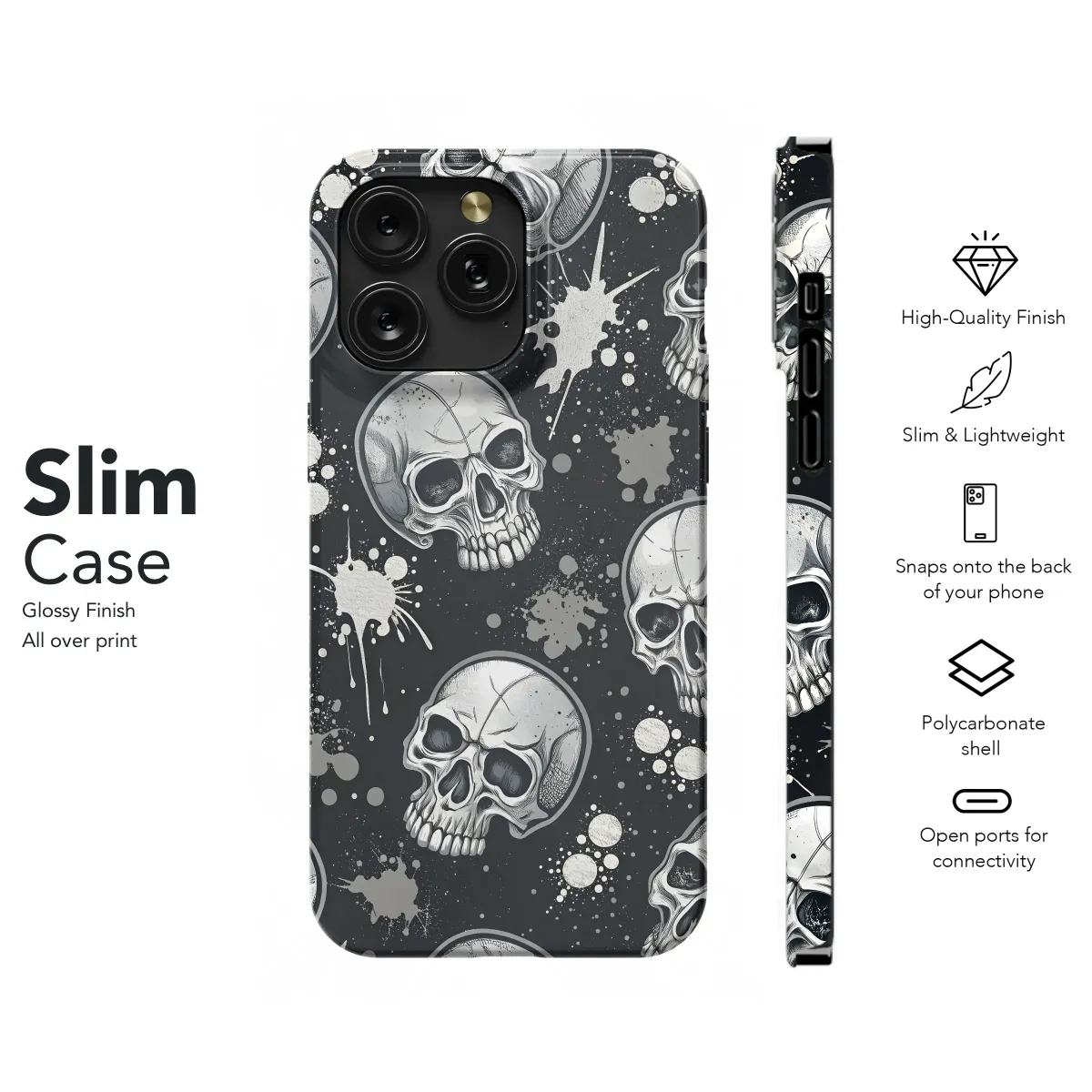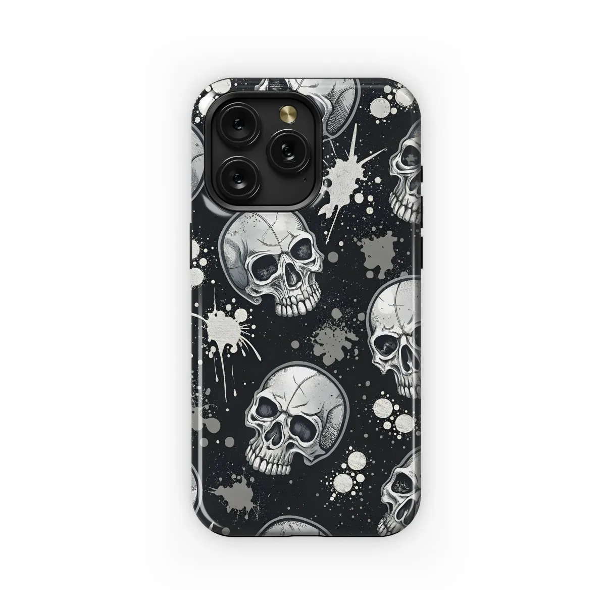 Showcase your edgy style with this striking design featuring intricately detailed skulls scattered against a backdrop of splattered paint. The monochromatic palette of silver and black creates a powerful and versatile aesthetic, perfect for adding a touch of rebellion to your everyday look. This high-quality print ensures vibrant colors and a long-lasting finish, resisting scratches and fading. The detailed skull imagery is both captivating and slightly macabre, making it a conversation starter and a unique expression of individuality. Ideal for those who appreciate bold designs and a touch of gothic flair, this piece is as unforgettable as it is stylish. Protect your device in head-turning fashion with this eye-catching graphic, demonstrating your personal style with every glance. This print is a must-have for anyone seeking a distinctive, high-impact accessory that will stand out from the crowd. The design seamlessly blends artistic detail with durable protection, guaranteeing both style and function. Order yours today and add a rebellious edge to your personal style.