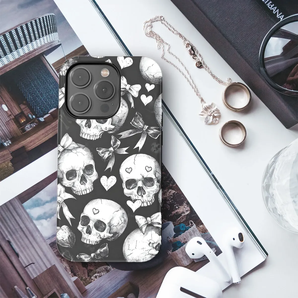 Add a touch of darkly romantic charm to your everyday carry with this unique accessory. This design features a captivating pattern of intricately detailed skulls, adorned with delicate bows and sweet hearts, creating a striking juxtaposition of macabre and cute aesthetics. The high-quality print ensures vibrant colors and crisp details that won't fade, maintaining its gothic-kawaii appeal for extended use. Perfect for those who appreciate a blend of dark elegance and playful whimsy, this item is a conversation starter and a testament to individual style. Its bold, yet stylish design makes it a perfect fit for personal expression, guaranteed to turn heads and spark admiration. The sophisticated grayscale palette adds to its timeless allure, ensuring this piece remains a favorite for years to come. Express your unique personality with this captivating and unforgettable design, ideal for adding a touch of edgy sweetness to your look. Embrace the unexpected and show off your individual style with this must-have accessory. This eye-catching pattern stands out from the crowd while complementing various outfits and personal tastes.