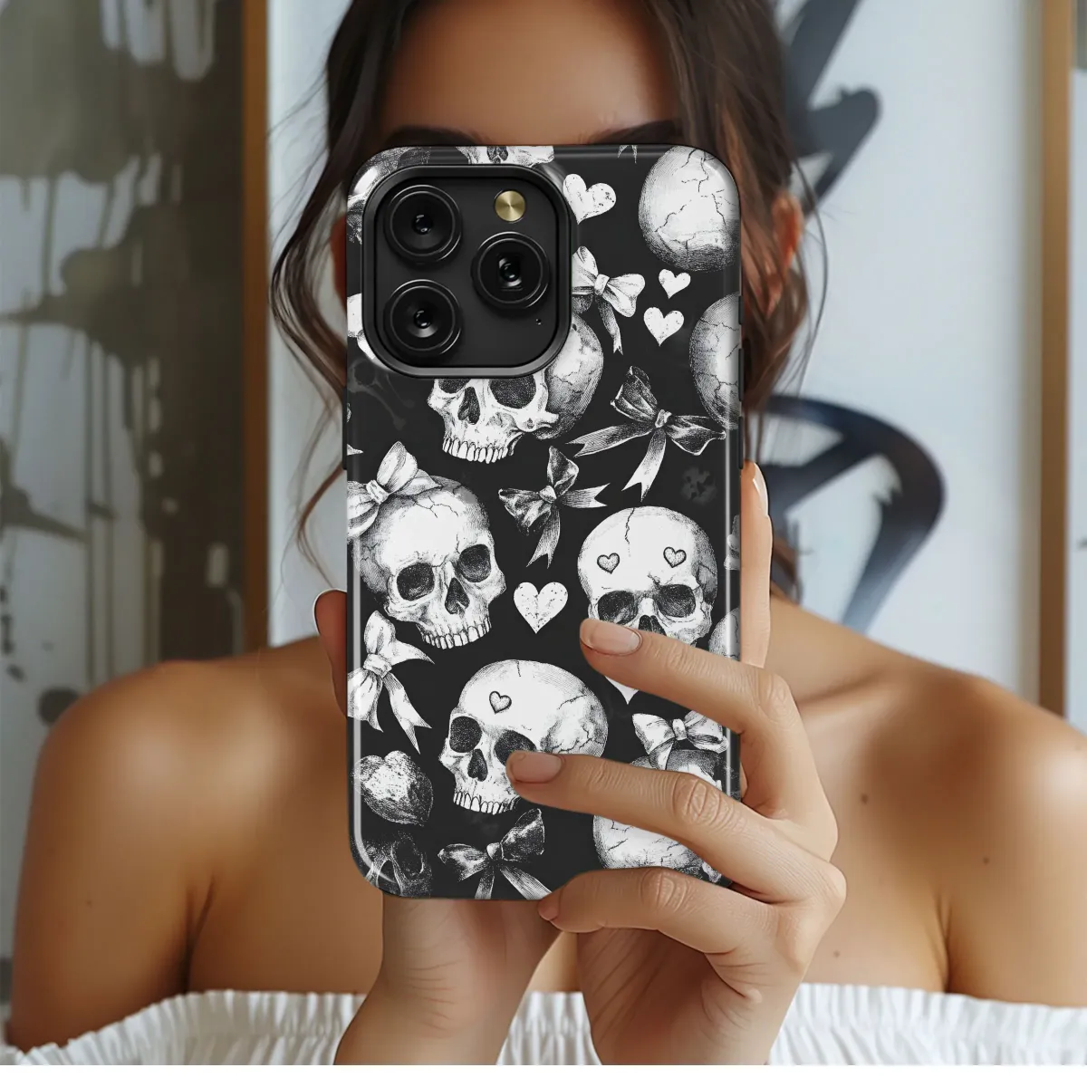 Add a touch of darkly romantic charm to your everyday carry with this unique accessory. This design features a captivating pattern of intricately detailed skulls, adorned with delicate bows and sweet hearts, creating a striking juxtaposition of macabre and cute aesthetics. The high-quality print ensures vibrant colors and crisp details that won't fade, maintaining its gothic-kawaii appeal for extended use. Perfect for those who appreciate a blend of dark elegance and playful whimsy, this item is a conversation starter and a testament to individual style. Its bold, yet stylish design makes it a perfect fit for personal expression, guaranteed to turn heads and spark admiration. The sophisticated grayscale palette adds to its timeless allure, ensuring this piece remains a favorite for years to come. Express your unique personality with this captivating and unforgettable design, ideal for adding a touch of edgy sweetness to your look. Embrace the unexpected and show off your individual style with this must-have accessory. This eye-catching pattern stands out from the crowd while complementing various outfits and personal tastes.