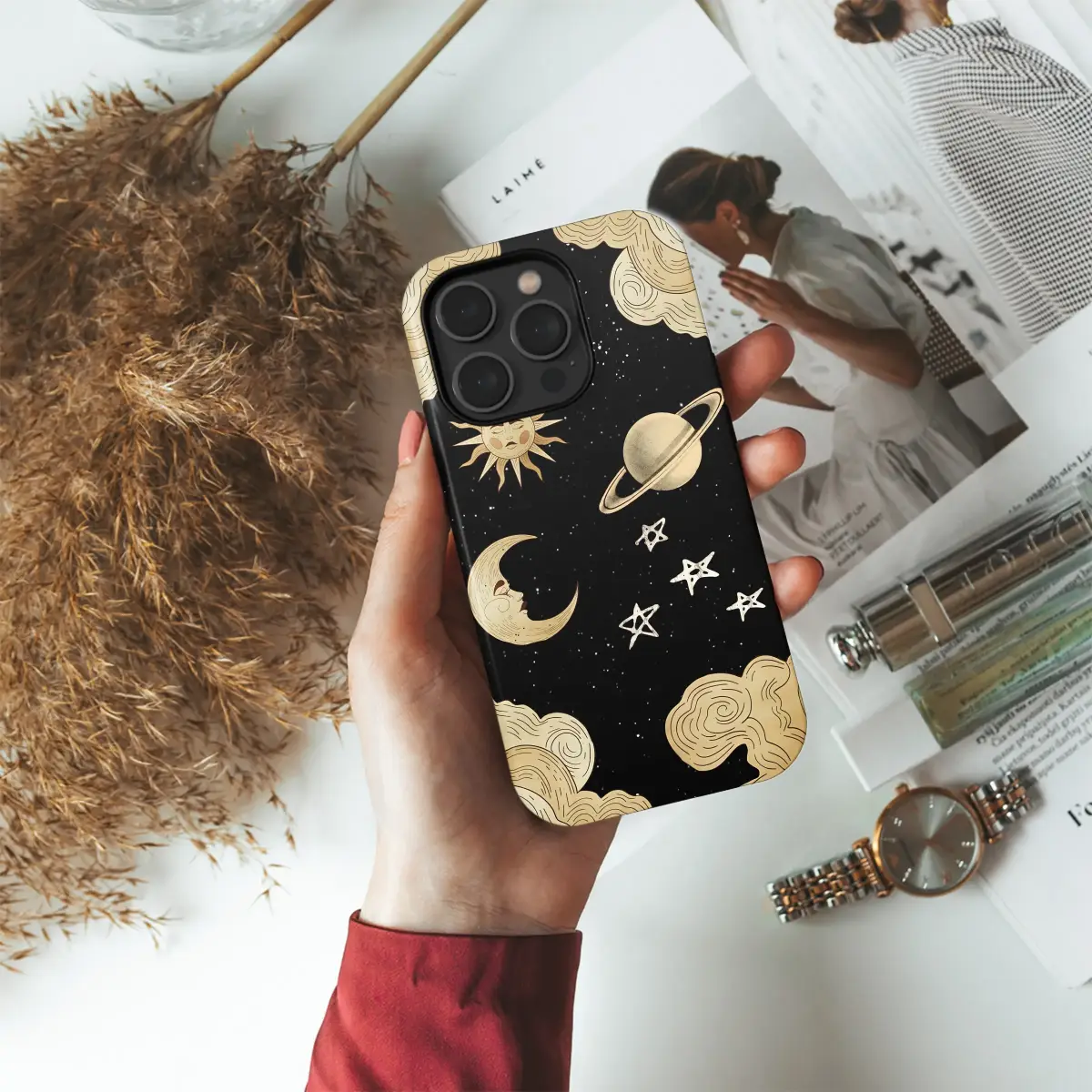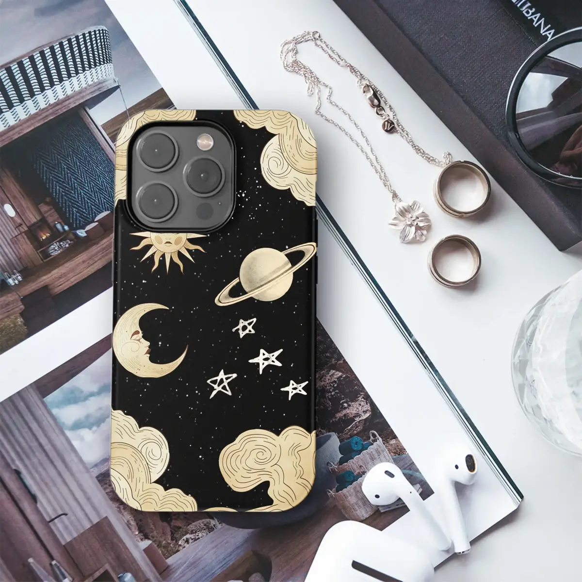 Wrap your most essential daily companion in a tapestry of the cosmos with this enchanting celestial artwork. Carry a pocketful of midnight magic and let your personal style shine with this witchy, vintage-inspired design. Against a deep, starry expanse, a benevolent sun and a dreaming crescent moon float in a timeless, cosmic ballet, their serene faces rendered in a beautiful, antique illustration style that evokes the pages of a forgotten grimoire. A distant, ringed planet drifts past whimsical, hand-drawn stars, all framed by billowy, retro clouds that feel like a peek into a storybook sky. This bohemian design is more than just a pretty picture; it's a protective piece of wearable art for the modern mystic, the astrology lover, and the daydreamer who finds comfort in the night sky. Let this spiritual, boho accessory safeguard your connection to the world, adding a touch of celestial elegance to your everyday moments. It’s the perfect unique gift for a kindred spirit or a stunning talisman to celebrate your own connection to the galaxy's mysterious beauty. Embrace the mystic aesthetic and let your soul connect with the sun, moon, and stars every time you reach for your device.