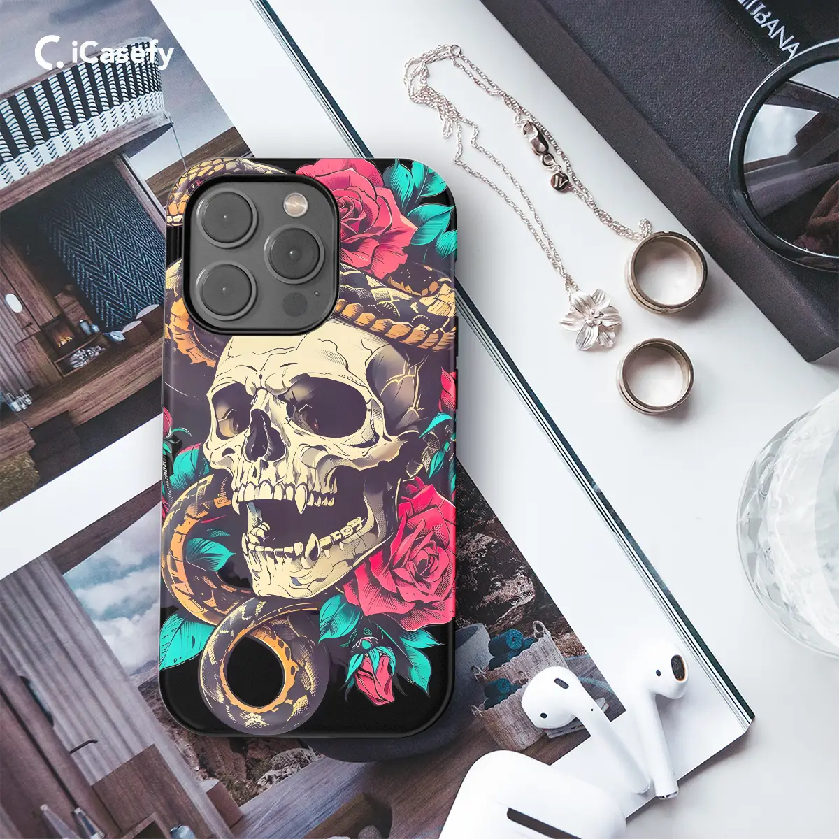 Embrace the macabre with this Snake Flower Skeleton Head Gothic Red Rose Phone Case. Its intricate pattern portrays a skull adorned with enchanting red roses, entwined with serpents – a symbol of strength and rebirth. This stylish accessory shields your device while channeling a touch of the gothic and the mysterious.