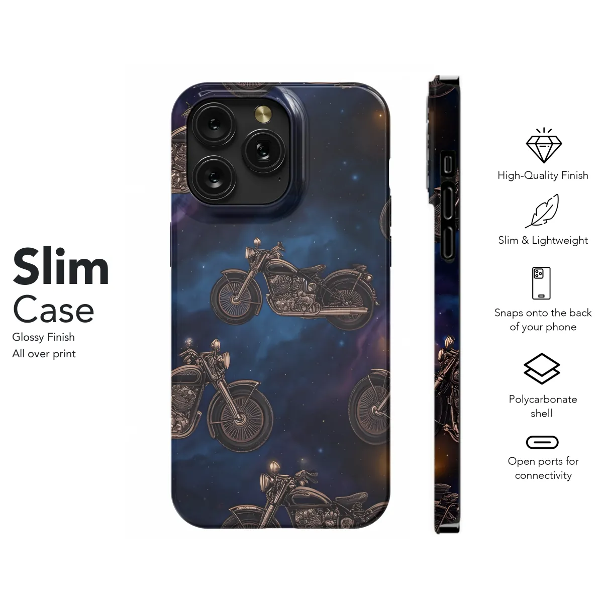 Protect your phone in style with our exclusive Space Motorcycles Phone Case. This durable case features vibrant graphics of sleek motorcycles racing through the vastness of space, creating a captivating and futuristic design. Available for iPhone, Samsung, and Pixel models, it's the perfect choice for tech-savvy adventurers and sci-fi enthusiasts. The sturdy construction safeguards your phone from bumps and scratches, while the precise cutouts ensure easy access to all buttons and ports. Let your phone soar through the cosmos with this one-of-a-kind Space Motorcycles Phone Case.