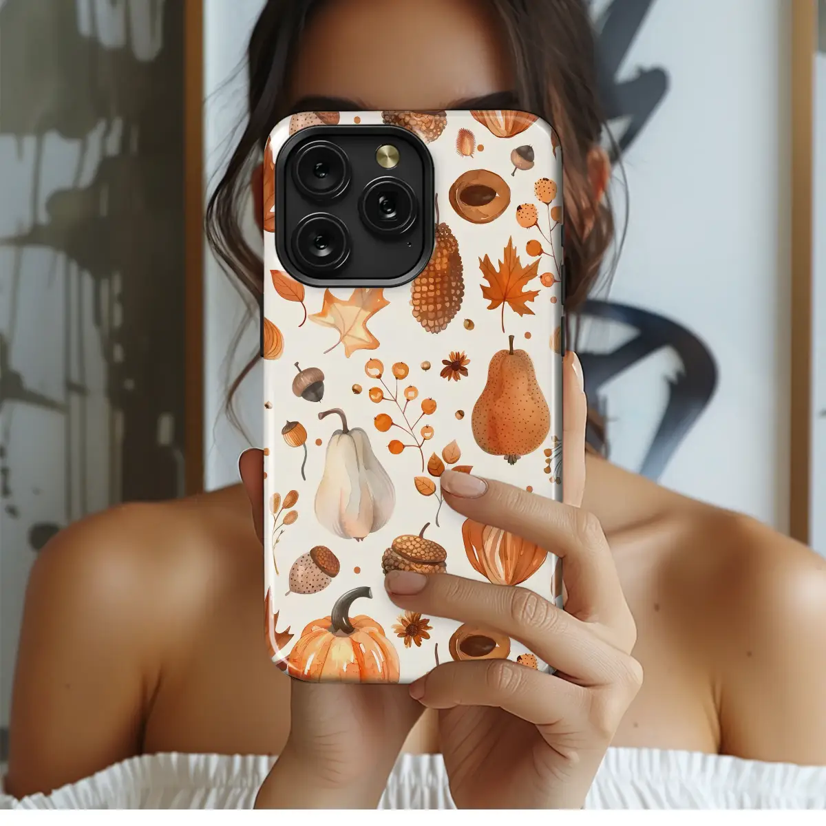 Wrap your daily companion in the warm, cozy embrace of the harvest season with this enchanting watercolor design. Evoking the feeling of a crisp walk through a sun-dappled orchard, this pattern is a beautiful celebration of autumn's bounty. A delightful medley of hand-painted pumpkins in shades of warm orange and soft cream, juicy pears, and rustic acorns are scattered artfully across a gentle, neutral background. Fiery maple leaves, delicate branches of fall berries, and whimsical pinecones complete this rustic tableau, bringing a touch of nature's magic to your fingertips. The rich, earthy palette of burnt sienna, deep ochre, and warm amber creates a visual symphony that feels both nostalgic and wonderfully fresh. It's a perfect accessory for the lover of all things fall, from pumpkin spice lattes to cozy sweater weather. This design isn't just a pattern; it's a portable piece of cottagecore art that lets you carry the serene and joyful spirit of autumn with you, adding a touch of whimsical charm to your every day. Let the gentle beauty of this fall harvest artwork be a constant reminder of golden afternoons and the simple, cozy pleasures of the season.
