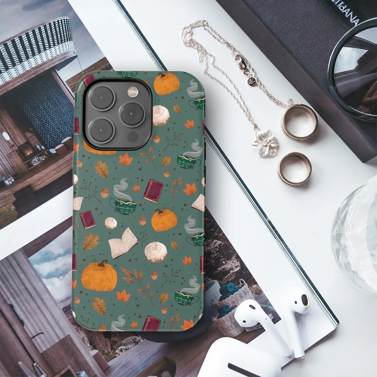 Embrace the magic of a crisp autumn afternoon, captured just for you. Wander through a whimsical scene set against a deep forest green, where plump, cheerful pumpkins nestle beside well-loved storybooks with rich burgundy spines, their pages whispering ancient tales. Delicate wisps of steam curl from ornate mugs filled with a warm, comforting brew, promising cozy moments ahead. Scattered amongst them are sweet, frosted pastries, rich auburn leaves, and tiny acorns, painting a perfect picture of the fall season. This enchanting design is a love letter to the cottagecore soul and the dark academia heart, perfect for anyone who believes that happiness is a good book and a cup of pumpkin spice. It's more than just a pattern; it's a feeling—the quiet joy of a reading nook, the comforting scent of autumn, and the serene beauty of the changing seasons. Let this beautiful illustration adorn your most essential daily companion, wrapping your tech in a protective layer of cozy charm and everyday magic. Carry a piece of your favorite season with you, a perfect book lover gift or a special treat to celebrate the enchanting fall vibes.