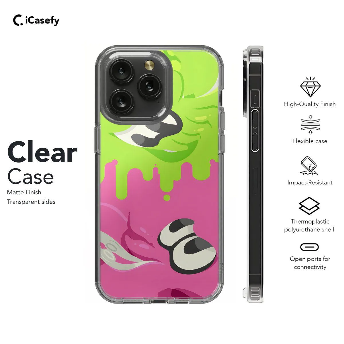 Dive into the vibrant world of Splatoon with this eye-catching phone case! Featuring iconic imagery from the game, including the Inklings, colorful ink splats, and dynamic gameplay scenes, this case is a must-have for any Splatoon fan. Protect your device in style and showcase your love for this beloved Nintendo franchise wherever you go. Let your phone become a canvas for the ink-slinging excitement of Splatoon with this stylish accessory!