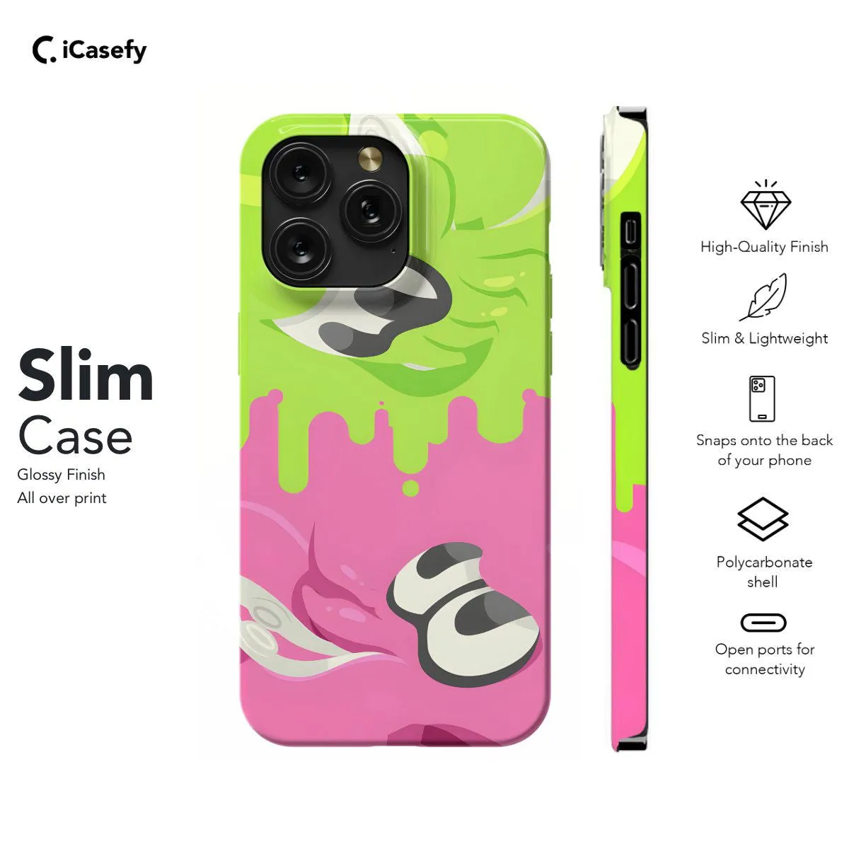 Dive into the vibrant world of Splatoon with this eye-catching phone case! Featuring iconic imagery from the game, including the Inklings, colorful ink splats, and dynamic gameplay scenes, this case is a must-have for any Splatoon fan. Protect your device in style and showcase your love for this beloved Nintendo franchise wherever you go. Let your phone become a canvas for the ink-slinging excitement of Splatoon with this stylish accessory!