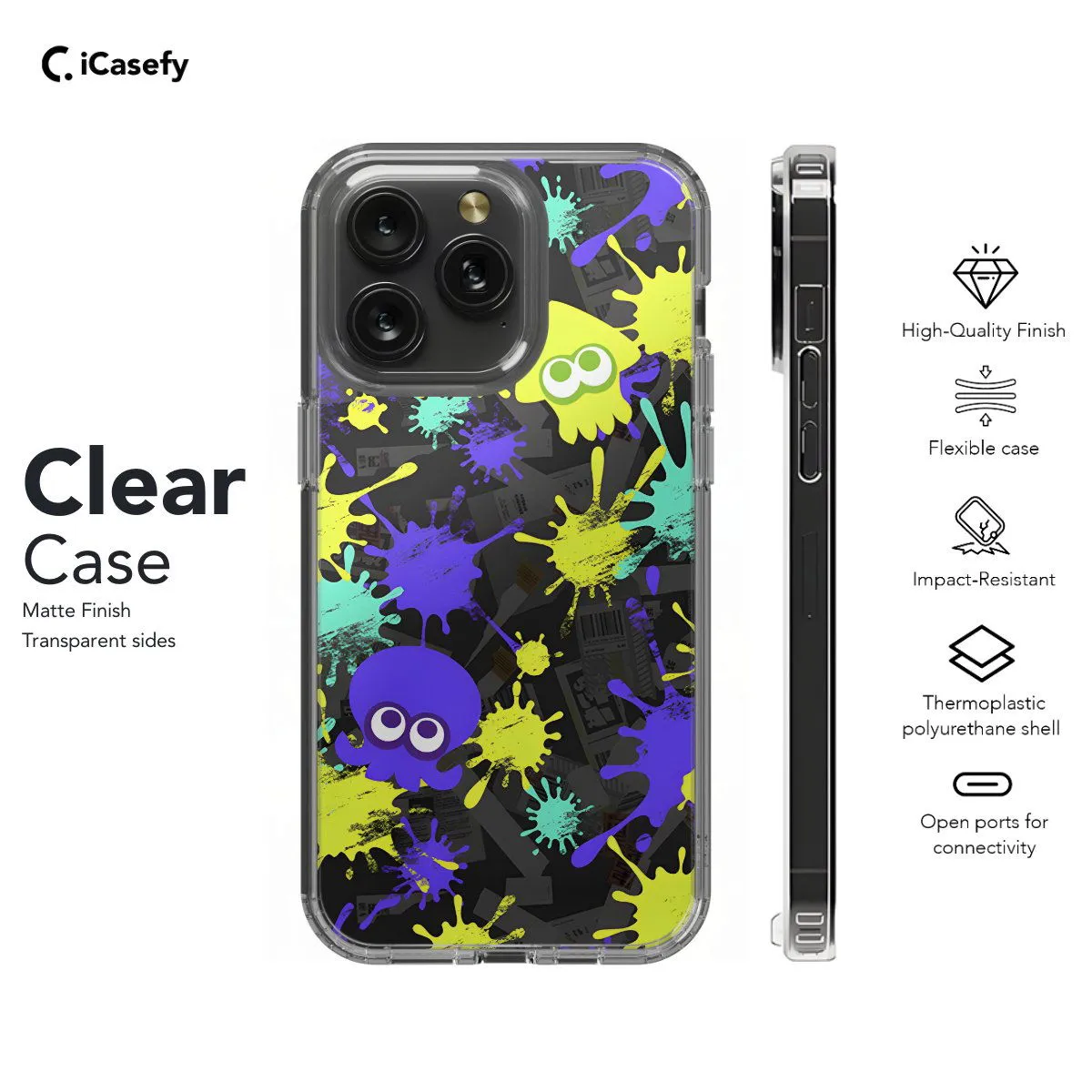 Dive into the vibrant world of Splatoon with this energetic phone case! Featuring the iconic Inklings, colorful ink splats, and dynamic gameplay scenes, this case is a must-have for any Splatoon enthusiast. Show off your love for this thrilling Nintendo franchise while keeping your device protected in style. Let your phone become a canvas for the ink-splattering fun of Splatoon with this eye-catching and playful accessory!