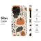 Embrace the enchanting magic of the harvest season with this captivating autumnal design. Picture yourself wandering through a whimsical pumpkin patch where vibrant orange gourds pop against a creamy, dreamy background. A beautiful scatter of fall leaves, rendered in striking charcoal black, warm rust, and soft beige tones, dances across the scene. Delicate spiderwebs and tiny berries add a touch of spooky charm, hinting at cozy Halloween nights and ghost stories told by the fire. The vintage-inspired, slightly textured illustration evokes a sense of nostalgic comfort, reminiscent of your favorite cozy sweater and a warm mug of spiced cider. This unique pattern perfectly captures the essence of October, effortlessly blending a rustic cottagecore aesthetic with a hint of dark academia for a truly bewitching look. It’s the perfect way to carry a piece of the crisp, colorful autumn air with you, adding a personal touch of seasonal style to your everyday essentials. Let this beautiful artwork be a daily reminder of crunchy leaves, pumpkin spice, and all the wonderful things that make fall the most magical time of the year. This design makes an ideal gift for any autumn lover, Halloween enthusiast, or anyone looking to infuse their world with a little bit of seasonal whimsy.