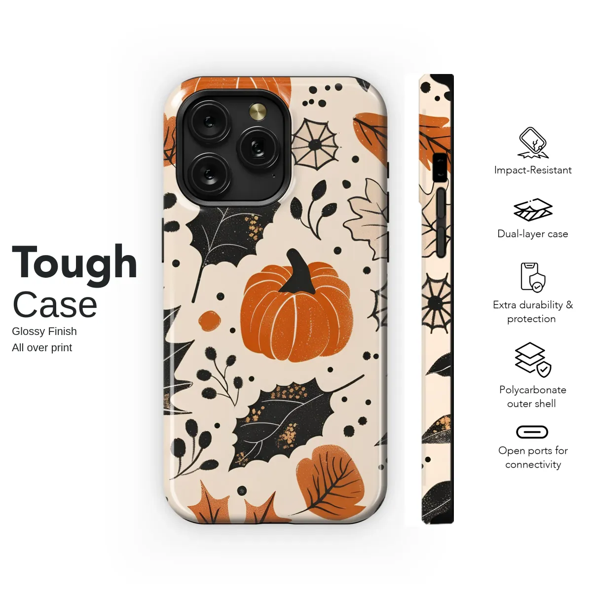 Embrace the enchanting magic of the harvest season with this captivating autumnal design. Picture yourself wandering through a whimsical pumpkin patch where vibrant orange gourds pop against a creamy, dreamy background. A beautiful scatter of fall leaves, rendered in striking charcoal black, warm rust, and soft beige tones, dances across the scene. Delicate spiderwebs and tiny berries add a touch of spooky charm, hinting at cozy Halloween nights and ghost stories told by the fire. The vintage-inspired, slightly textured illustration evokes a sense of nostalgic comfort, reminiscent of your favorite cozy sweater and a warm mug of spiced cider. This unique pattern perfectly captures the essence of October, effortlessly blending a rustic cottagecore aesthetic with a hint of dark academia for a truly bewitching look. It’s the perfect way to carry a piece of the crisp, colorful autumn air with you, adding a personal touch of seasonal style to your everyday essentials. Let this beautiful artwork be a daily reminder of crunchy leaves, pumpkin spice, and all the wonderful things that make fall the most magical time of the year. This design makes an ideal gift for any autumn lover, Halloween enthusiast, or anyone looking to infuse their world with a little bit of seasonal whimsy.