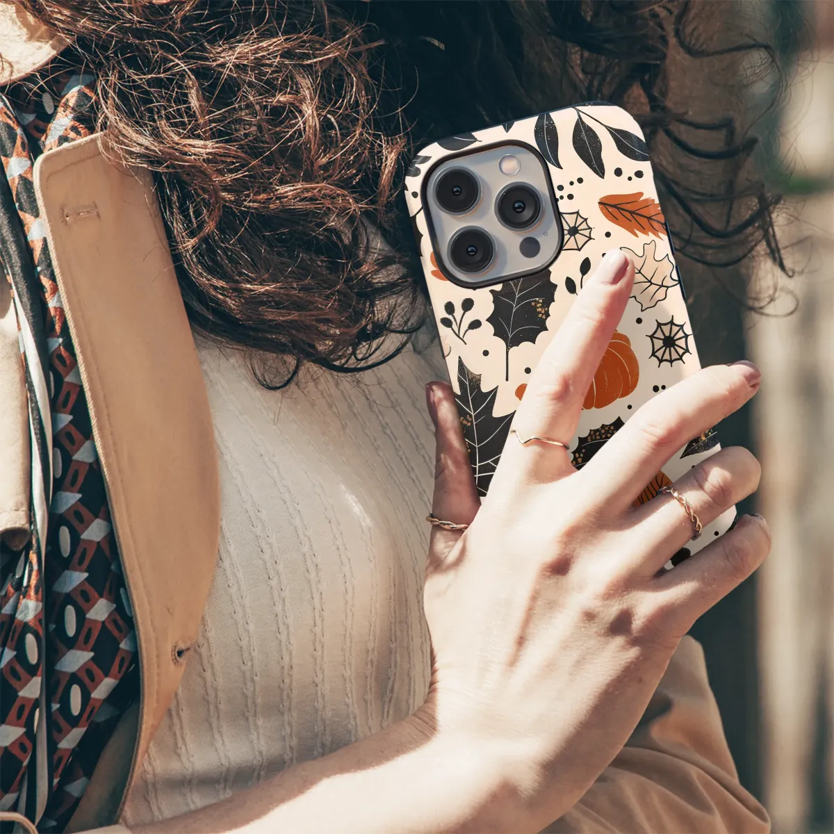 Embrace the enchanting magic of the harvest season with this captivating autumnal design. Picture yourself wandering through a whimsical pumpkin patch where vibrant orange gourds pop against a creamy, dreamy background. A beautiful scatter of fall leaves, rendered in striking charcoal black, warm rust, and soft beige tones, dances across the scene. Delicate spiderwebs and tiny berries add a touch of spooky charm, hinting at cozy Halloween nights and ghost stories told by the fire. The vintage-inspired, slightly textured illustration evokes a sense of nostalgic comfort, reminiscent of your favorite cozy sweater and a warm mug of spiced cider. This unique pattern perfectly captures the essence of October, effortlessly blending a rustic cottagecore aesthetic with a hint of dark academia for a truly bewitching look. It’s the perfect way to carry a piece of the crisp, colorful autumn air with you, adding a personal touch of seasonal style to your everyday essentials. Let this beautiful artwork be a daily reminder of crunchy leaves, pumpkin spice, and all the wonderful things that make fall the most magical time of the year. This design makes an ideal gift for any autumn lover, Halloween enthusiast, or anyone looking to infuse their world with a little bit of seasonal whimsy.