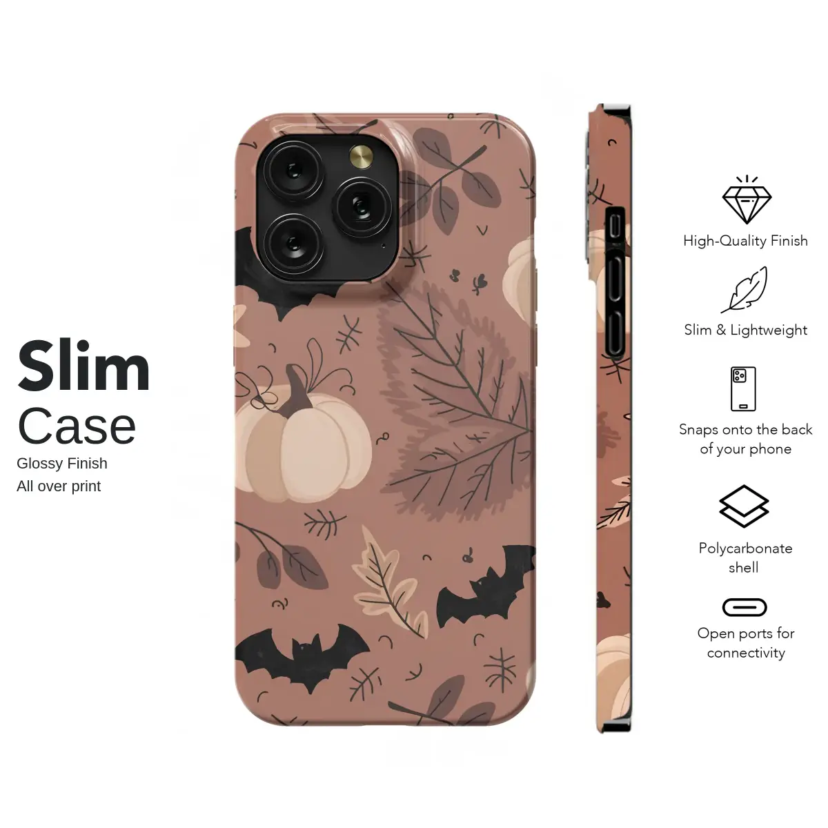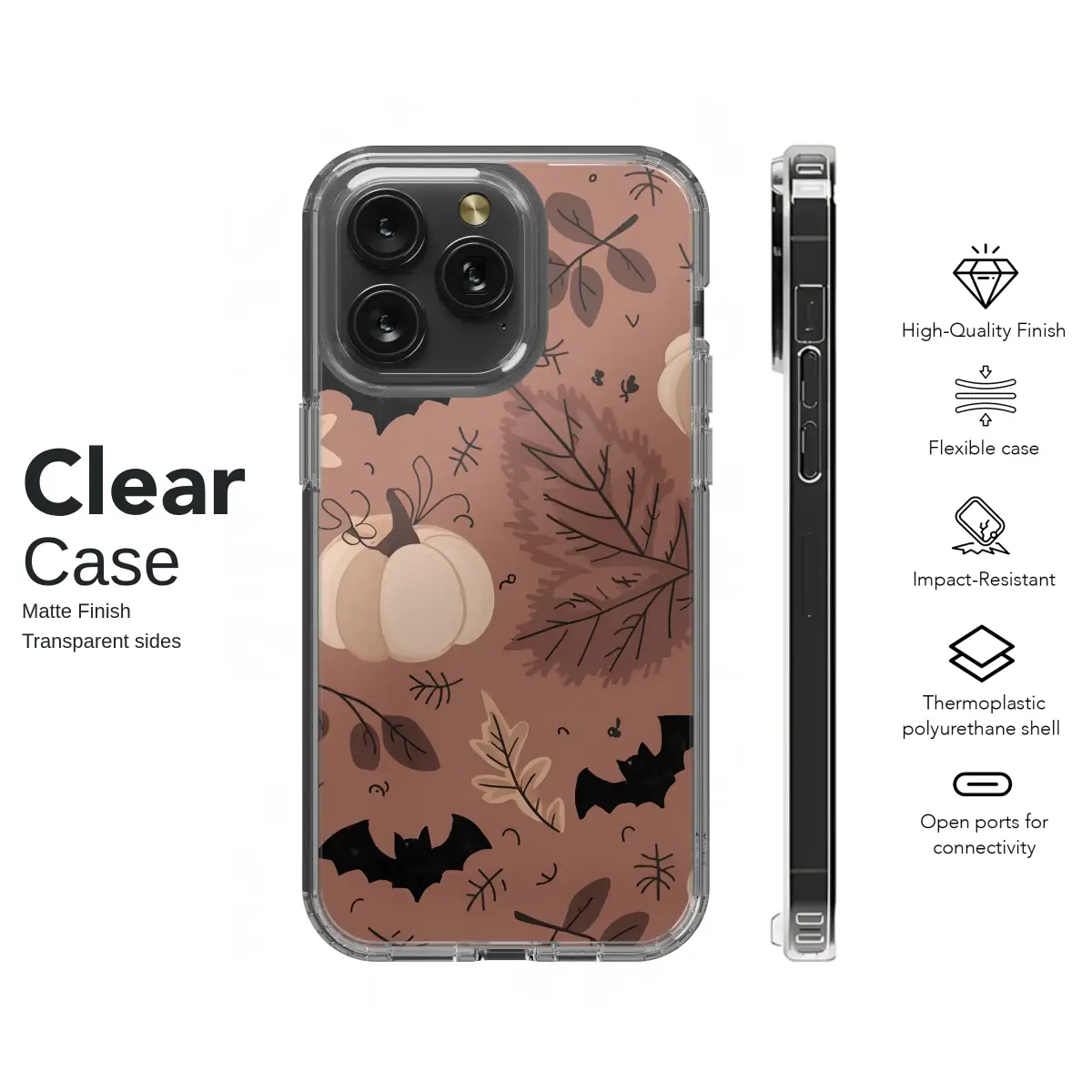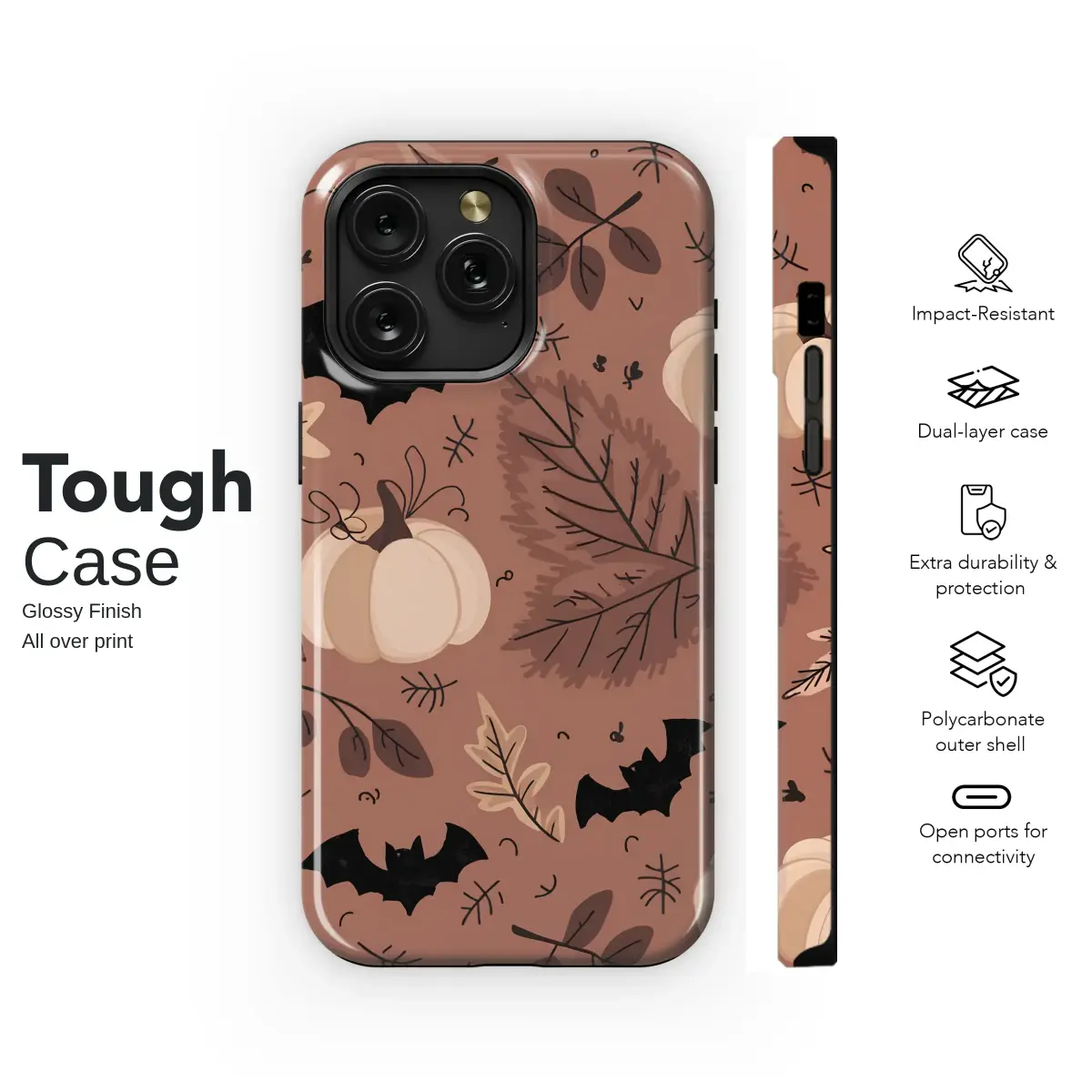 Embrace the magical whisper of autumn with this enchanting design, where the charm of a cozy harvest meets the delightful spookiness of twilight. Set against a warm, terracotta earth-toned background, a whimsical pattern unfolds, telling a story of a cool, crisp evening in a magical woodland. Creamy white pumpkins nestle amongst a scatter of delicate, hand-drawn autumn leaves in rich shades of mocha and beige, while charming black bats dance playfully between the foliage. This illustrative artwork wraps your daily essential in the feeling of the coziest season—it's the visual equivalent of pulling on your favorite sweater, the scent of cinnamon in the air, and the crunch of leaves underfoot. Perfect for the lover of all things cottagecore, boho, and spooky-cute, this design captures that fleeting moment between the golden glow of fall and the mysterious allure of All Hallows' Eve. It’s a beautiful way to personalize your most important accessory, adding a layer of unique style that celebrates the season. Carry a piece of the enchanted autumn forest with you, making it a thoughtful gift for anyone who counts down the days to pumpkin spice and believes in a little everyday magic.