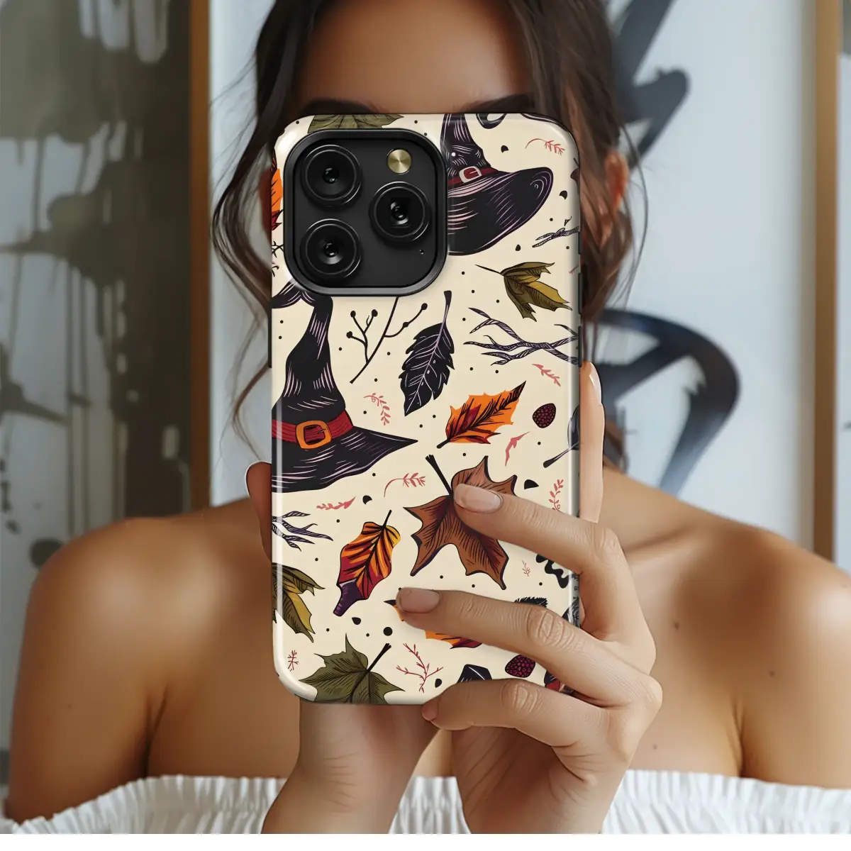 Step into a world where autumn's magic is woven into every detail. This enchanting design captures the heart of the spooky season, inviting you to wander through a mystical woodland where the veil is thin. Imagine the satisfying crunch of fallen leaves underfoot as whimsical witch hats, tossed by a playful breeze, dance among a kaleidoscope of autumnal colors. Deep crimson, burnt orange, and rich earthy browns mingle with dark, mysterious feathers and the stark beauty of gnarled branches, all set against a warm, creamy backdrop. The intricate, hand-drawn linocut style evokes a sense of timeless folklore and rustic charm, perfect for curating a personal aesthetic that blends cottagegore with a touch of dark academia. This isn't just a pattern; it's an atmosphere, a feeling of cozy evenings, whispered spells, and the enchanting energy of the harvest moon. Let this captivating artwork adorn your favorite accessory, making it a perfect statement piece for Halloween lovers or a thoughtful, magical gift for anyone who finds comfort and wonder in the whimsical side of the gothic. Carry the spirit of an enchanted autumn with you and let your everyday items tell a story of magic and mystery.