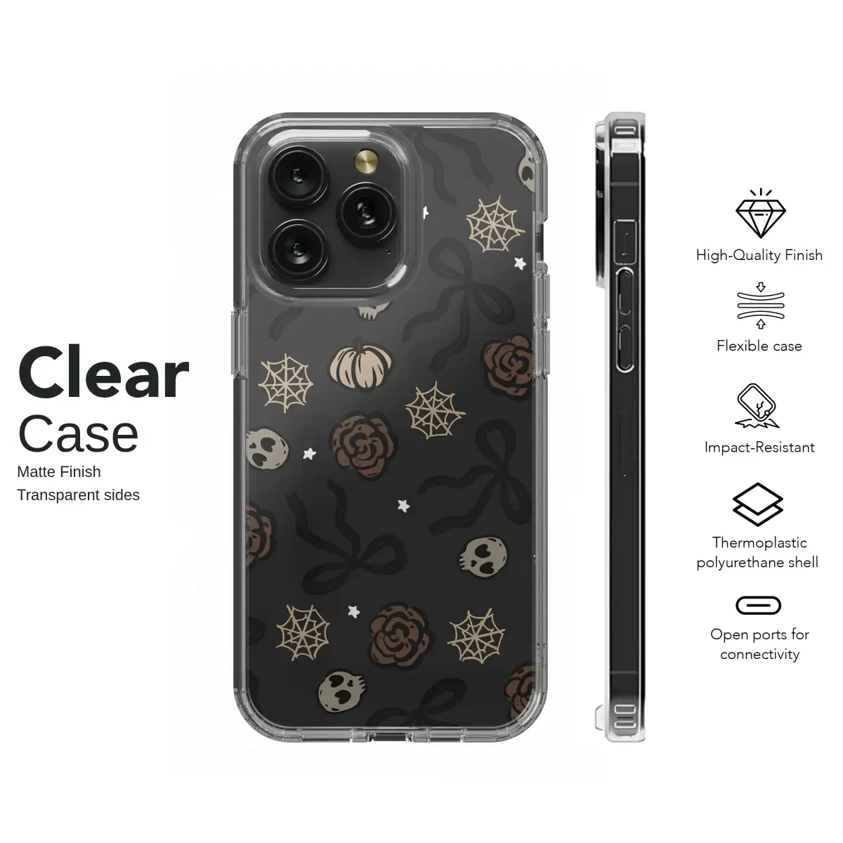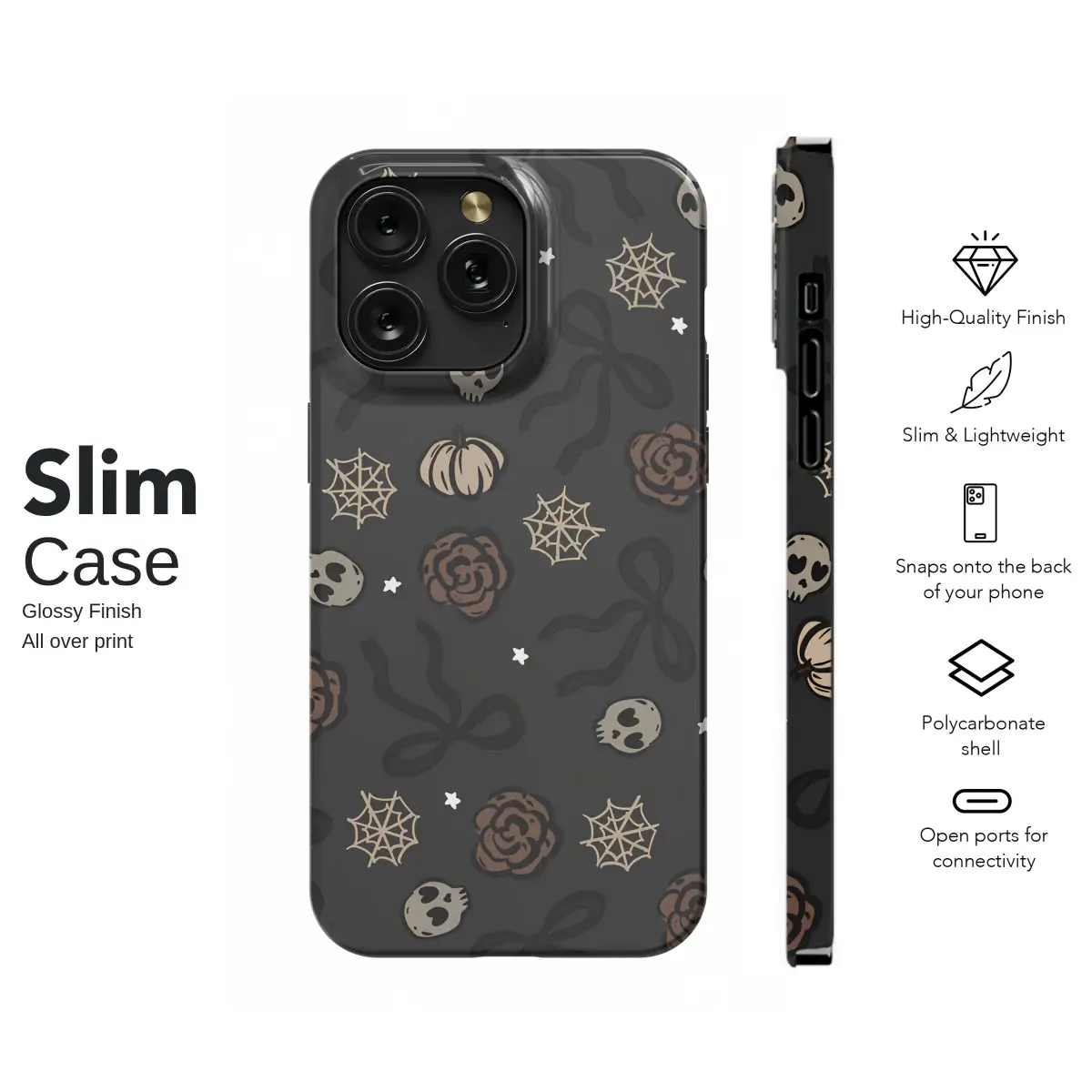 Step into a world where spooky season charm meets delicate romance with this enchanting hand-drawn pattern. Our unique design captures a midnight garden scattered with whimsical doodles of dusky brown roses blooming beside sweet, heart-eyed skulls. Elegant black bows float like secrets in the night, tying the whole aesthetic together, while tiny pumpkins and intricate spiderwebs add a touch of autumnal magic. Sprinkled with little stars against a deep charcoal canvas, this isn't just a pattern; it's a mood. Perfect for the lover of all things whimsigoth, coquette goth, and dark academia, this artwork adds a layer of curated personality to your everyday essentials. It’s for those who find beauty in the shadows and romance in the macabre. Let this enchanting design wrap your favorite device in a story of autumn nights and spooky delights, making a subtle yet captivating statement wherever you go. Embrace the enchanting contradiction of cute and creepy, and carry a piece of this magical world with you.