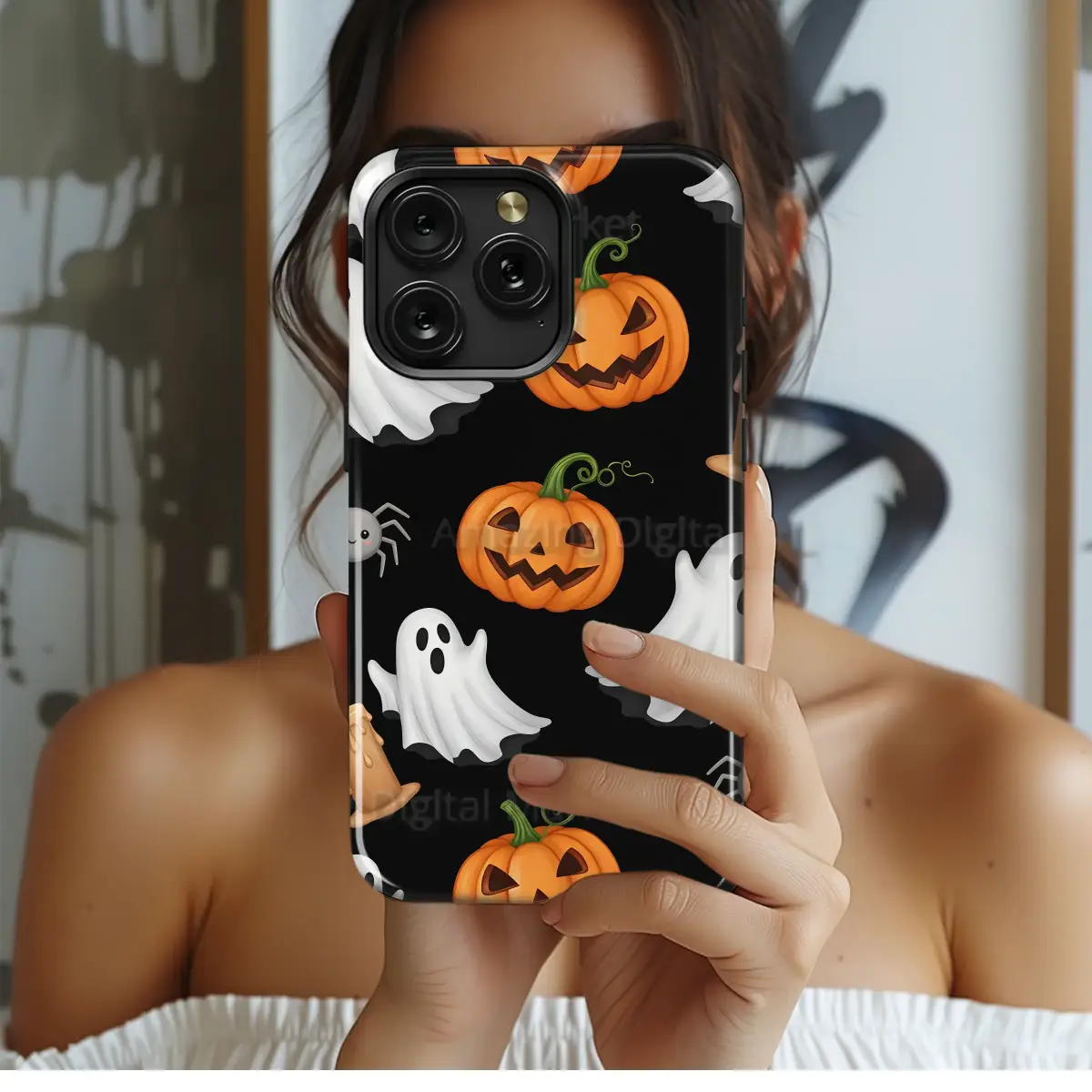 Step into a world where the veil is thin and the autumn night comes alive with enchanting whispers. This captivating design captures the heart of Halloween, a whimsical midnight gathering under a moonless sky. Adorable little ghosts, with their surprised 'boo' expressions, playfully float and dance through the darkness. They are joined by a cheerful patch of jack-o'-lanterns, each one grinning with a mischievous, fiery light that seems to flicker with secret stories of spooky seasons past. Tiny, friendly spiders with rosy cheeks scuttle between the pumpkins, adding a touch of sweet charm to the eerie fun. The scene is illuminated by the soft, warm glow of melting candles, casting long, dancing shadows and creating an atmosphere of cozy mystery. This pattern isn't just a design; it's a celebration of all things delightfully spooky and sweet. Carry a piece of this magical, haunted festivity with you, a perfect accessory to showcase your love for the crisp air, the rustling leaves, and the playful spirits of fall. Let this charming pattern be your daily reminder of the magic that stirs when October comes to call, wrapping your most essential item in the spirit of the season. Embrace the playful spookiness and make every day feel like Halloween!