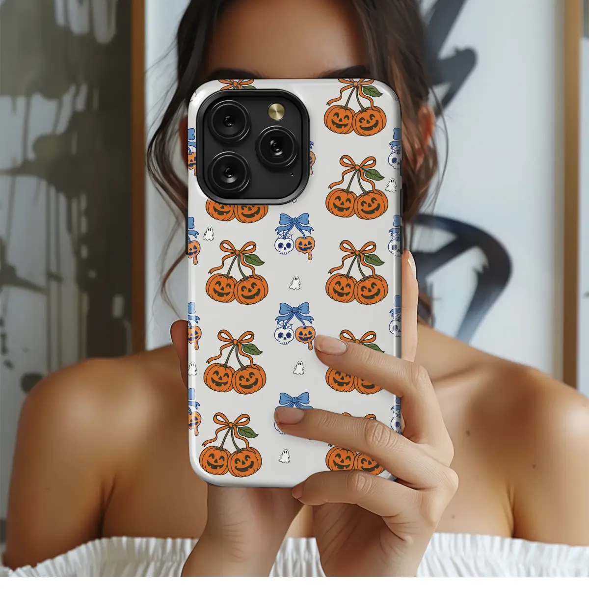 Embrace the enchanting spirit of autumn with a design that's equal parts sweet and spooky, a true celebration of Halloween charm. Dive into a whimsical world where cheerful jack-o'-lanterns grow in pairs like the ripest cherries, their carved smiles beaming with festive glee as they're tied together with bright orange ribbons. Floating between these pumpkin patches are the friendliest little ghosts you’ve ever seen, adding a touch of gentle, playful haunting to the delightful scene. Look closer and you’ll discover the wonderfully weird details: charmingly eerie skull-cherries, adorned with delicate spiderwebs and tied with silken blue bows, hang alongside their melting pumpkin pals. This unique seamless pattern captures the playful heart of the spooky season, blending classic Halloween icons with a fresh, kawaii aesthetic. It's a nostalgic nod to trick-or-treating and crisp autumn air. Perfect for anyone who adores the cuter side of spooky, this artwork is a fantastic way to personalize your daily essentials. Let this captivating design be your perfect companion for fall and beyond, a constant reminder of the playful fun and whimsical wonder of All Hallows' Eve, turning your everyday gear into a statement of your love for the coziest, spookiest time of year.