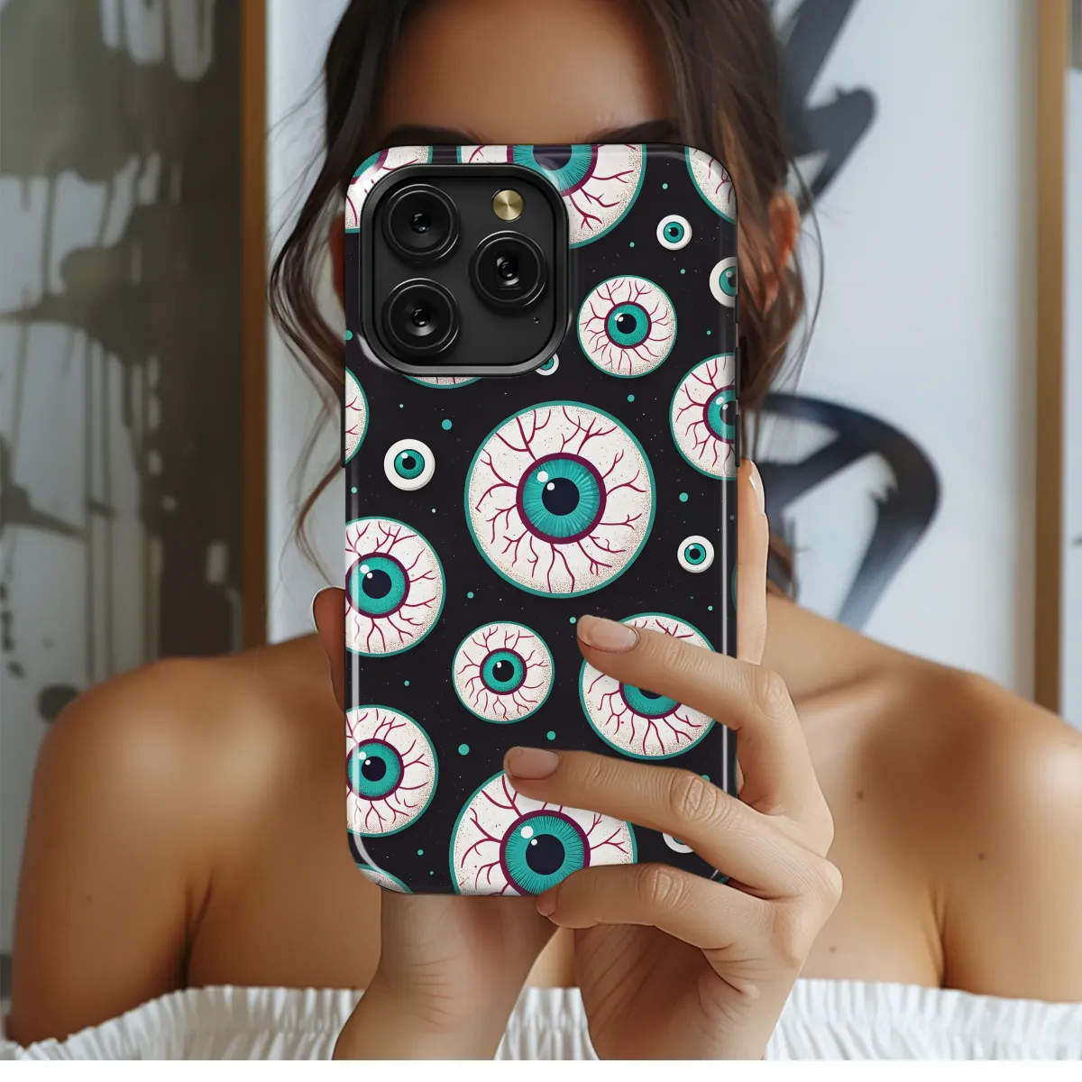 This spooky, stylish design features a captivating pattern of vibrant teal eyes set against a dark, textured background. Each eye is meticulously detailed with intricate veins and a haunting realism, creating a striking visual effect perfect for adding a touch of gothic charm to your accessories. The bold color contrast and high-quality graphic ensure your new design will turn heads. This unique artwork is ideal for expressing your individual style and adding a mysterious, eye-catching touch to your everyday carry. The design's versatile aesthetic blends seamlessly with various outfits and personal tastes, making it a perfect gift for yourself or a friend who appreciates dark and artistic aesthetics. Its eye-catching design will make your device stand out from the crowd, showcasing your bold and unique personality. The high-resolution print ensures vibrant colors and exceptional clarity, preserving the intricate details of the artwork for a long-lasting, high-quality finish. Showcase your love for the macabre with this undeniably captivating and unforgettable design.