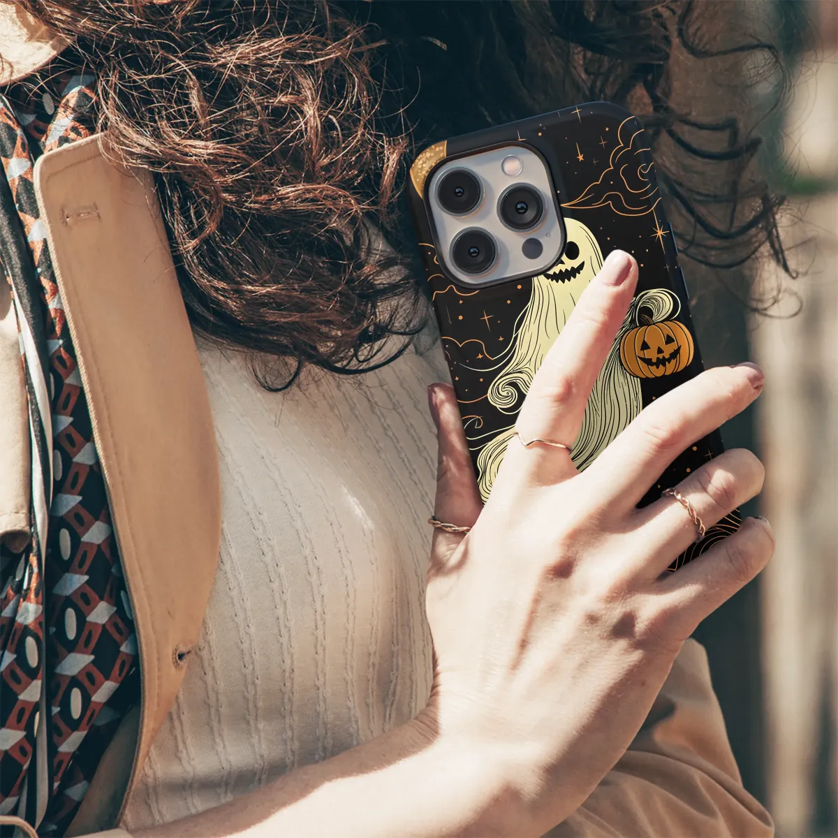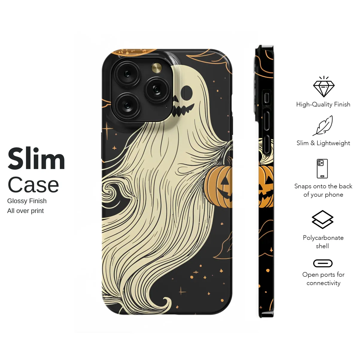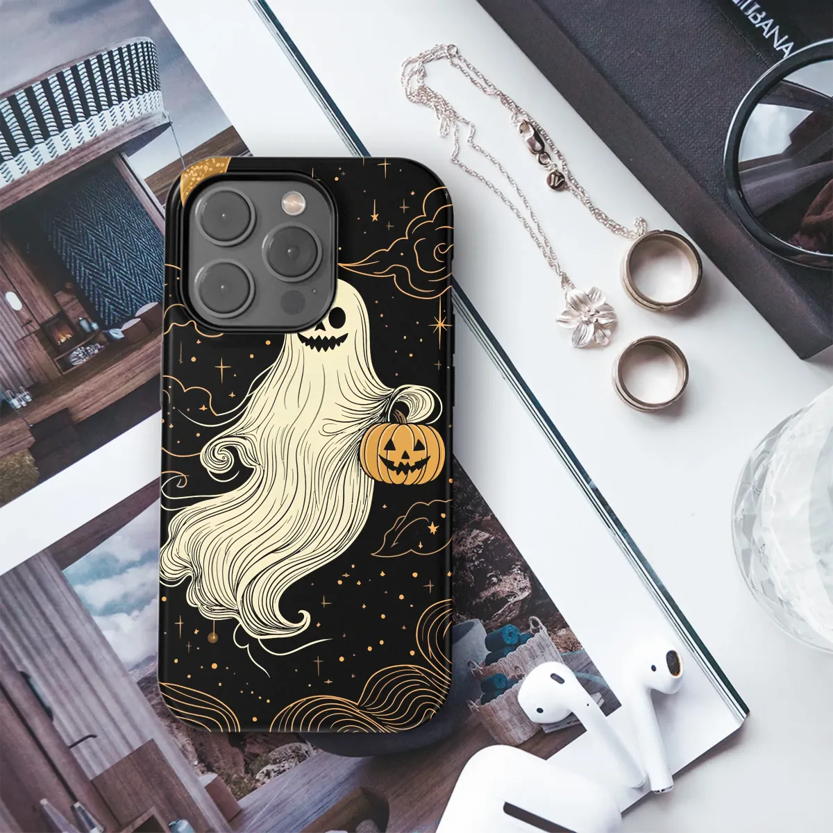 Embrace the magic of the witching hour with this enchanting design, where spooky meets sweet under a celestial canopy. A friendly, flowing ghost with a wide, mischievous grin drifts through the inky blackness of a star-dusted night sky, its ethereal form a cascade of delicate, swirling lines that suggest graceful movement. In one hand, it playfully carries a classic jack-o'-lantern, its own cheerful grin echoing the spirit of Halloween fun and cozy nostalgia. A beautifully textured, golden crescent moon hangs above, casting a soft, warm glow upon whimsical, stylized clouds that float by. This captivating artwork perfectly captures the mysterious allure of the spooky season, blending a touch of gothic elegance with a playful, 'spooky cute' aesthetic. It's an ideal accessory for the lover of all things fall and anyone who cherishes witchy vibes. Let this little phantom be your charming companion, adding a whisper of otherworldly wonder and cozy autumn spirit to your daily essentials, making every glance a trip into a haunted fairytale.