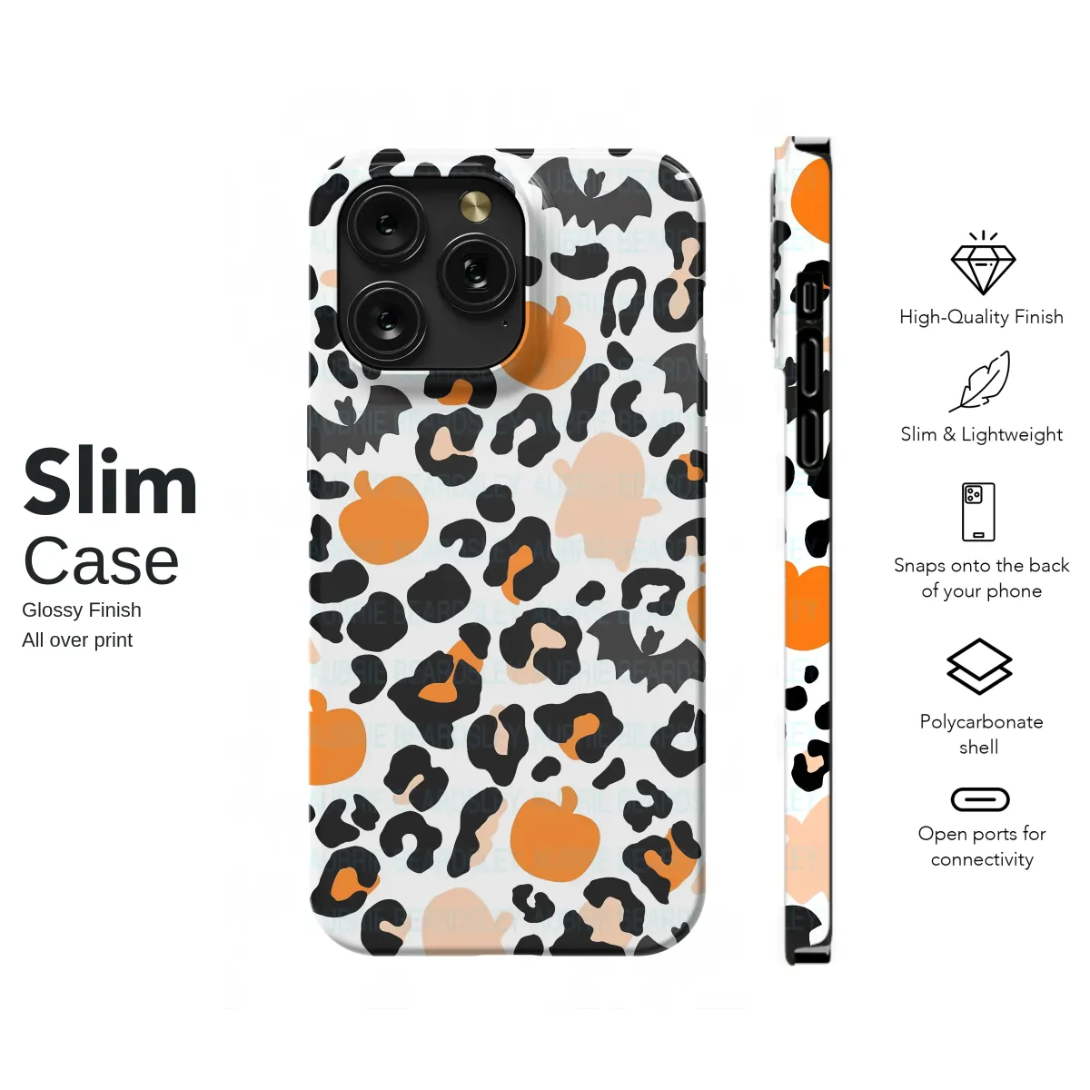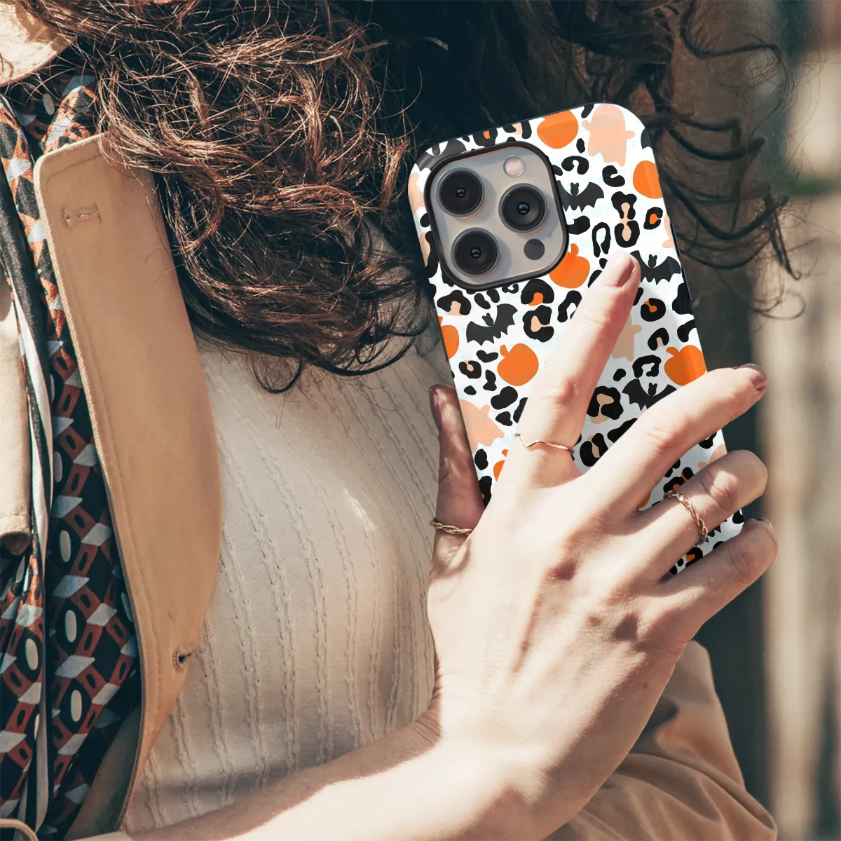 Unleash your wild side this spooky season with a fiercely fun design that perfectly captures the magic of autumn. This captivating artwork blends the untamed, chic energy of leopard print with the playful spirit of Halloween, creating a seamless pattern that is both stylish and charming. Imagine wrapping your favorite accessory in this visual treat, where classic animal print spots mingle with iconic holiday figures. Scattered amongst the bold black and orange spots, you'll find vibrant pumpkins glowing with harvest warmth, friendly little ghosts drifting playfully, and mysterious black bats taking flight against a crisp white background. This isn't just a pattern; it's a statement of personality for anyone who adores the fall aesthetic and isn't afraid to make a bold impression. The unique combination of trendy animal print and beloved Halloween motifs makes it the ultimate design for all your October adventures. Elevate your daily gear with a touch of spooky glam that’s perfect for pumpkin patch photoshoots, navigating corn mazes, or simply adding a festive pop to your everyday look. Carry the vibrant, spirited energy of Halloween with you everywhere you go and let your personal style roar with festive delight and untamed sophistication.