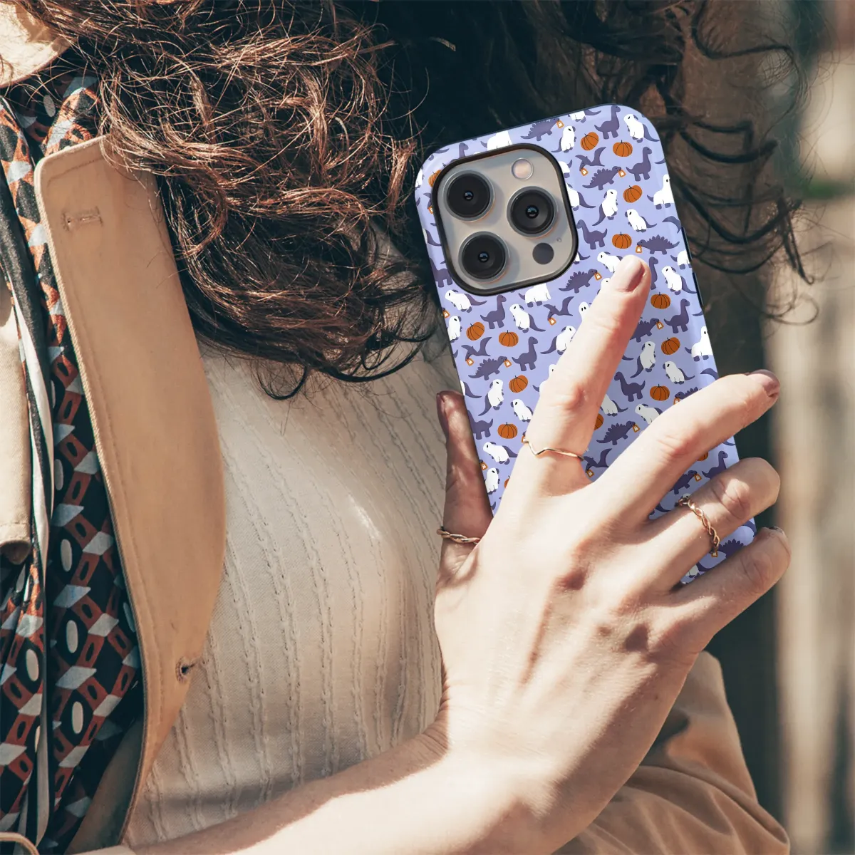 Step into a whimsically prehistoric Halloween where spooky season meets adorable dinosaurs! This captivating pattern brings a playful party to life on a dreamy lavender backdrop. Watch as charming Brontosaurus and Stegosaurus friends, cleverly disguised in classic ghost costumes, wander among cheerful orange pumpkins. Look closer, and you'll see Pterodactyls soaring through the scene, clutching tiny trick-or-treat bags, ready for a night of sweet delights. The friendly ghost dinos, with their simple, sweet expressions, add a touch of kawaii charm, making this design irresistibly cute rather than creepy. It's a design that captures the pure, nostalgic magic of Halloween—the excitement of dressing up and the simple joy of a pumpkin patch visit, all with a unique, jurassic twist. This isn't just a pattern; it's a tiny, portable celebration of your favorite season, perfect for anyone who loves a mix of cute aesthetics and dino-mite fun. Let this delightful legion of ghost-o-saurs protect your daily essentials, adding a burst of personality and a conversation-starting piece of art to your everyday carry. A perfect gift for dinosaur lovers and Halloween enthusiasts who appreciate a touch of pastel goth style.