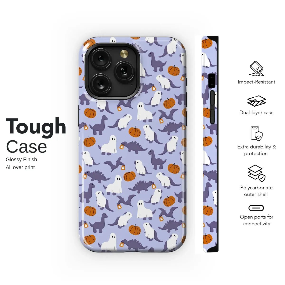 Step into a whimsically prehistoric Halloween where spooky season meets adorable dinosaurs! This captivating pattern brings a playful party to life on a dreamy lavender backdrop. Watch as charming Brontosaurus and Stegosaurus friends, cleverly disguised in classic ghost costumes, wander among cheerful orange pumpkins. Look closer, and you'll see Pterodactyls soaring through the scene, clutching tiny trick-or-treat bags, ready for a night of sweet delights. The friendly ghost dinos, with their simple, sweet expressions, add a touch of kawaii charm, making this design irresistibly cute rather than creepy. It's a design that captures the pure, nostalgic magic of Halloween—the excitement of dressing up and the simple joy of a pumpkin patch visit, all with a unique, jurassic twist. This isn't just a pattern; it's a tiny, portable celebration of your favorite season, perfect for anyone who loves a mix of cute aesthetics and dino-mite fun. Let this delightful legion of ghost-o-saurs protect your daily essentials, adding a burst of personality and a conversation-starting piece of art to your everyday carry. A perfect gift for dinosaur lovers and Halloween enthusiasts who appreciate a touch of pastel goth style.