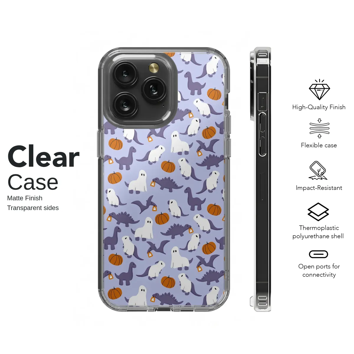 Step into a whimsically prehistoric Halloween where spooky season meets adorable dinosaurs! This captivating pattern brings a playful party to life on a dreamy lavender backdrop. Watch as charming Brontosaurus and Stegosaurus friends, cleverly disguised in classic ghost costumes, wander among cheerful orange pumpkins. Look closer, and you'll see Pterodactyls soaring through the scene, clutching tiny trick-or-treat bags, ready for a night of sweet delights. The friendly ghost dinos, with their simple, sweet expressions, add a touch of kawaii charm, making this design irresistibly cute rather than creepy. It's a design that captures the pure, nostalgic magic of Halloween—the excitement of dressing up and the simple joy of a pumpkin patch visit, all with a unique, jurassic twist. This isn't just a pattern; it's a tiny, portable celebration of your favorite season, perfect for anyone who loves a mix of cute aesthetics and dino-mite fun. Let this delightful legion of ghost-o-saurs protect your daily essentials, adding a burst of personality and a conversation-starting piece of art to your everyday carry. A perfect gift for dinosaur lovers and Halloween enthusiasts who appreciate a touch of pastel goth style.