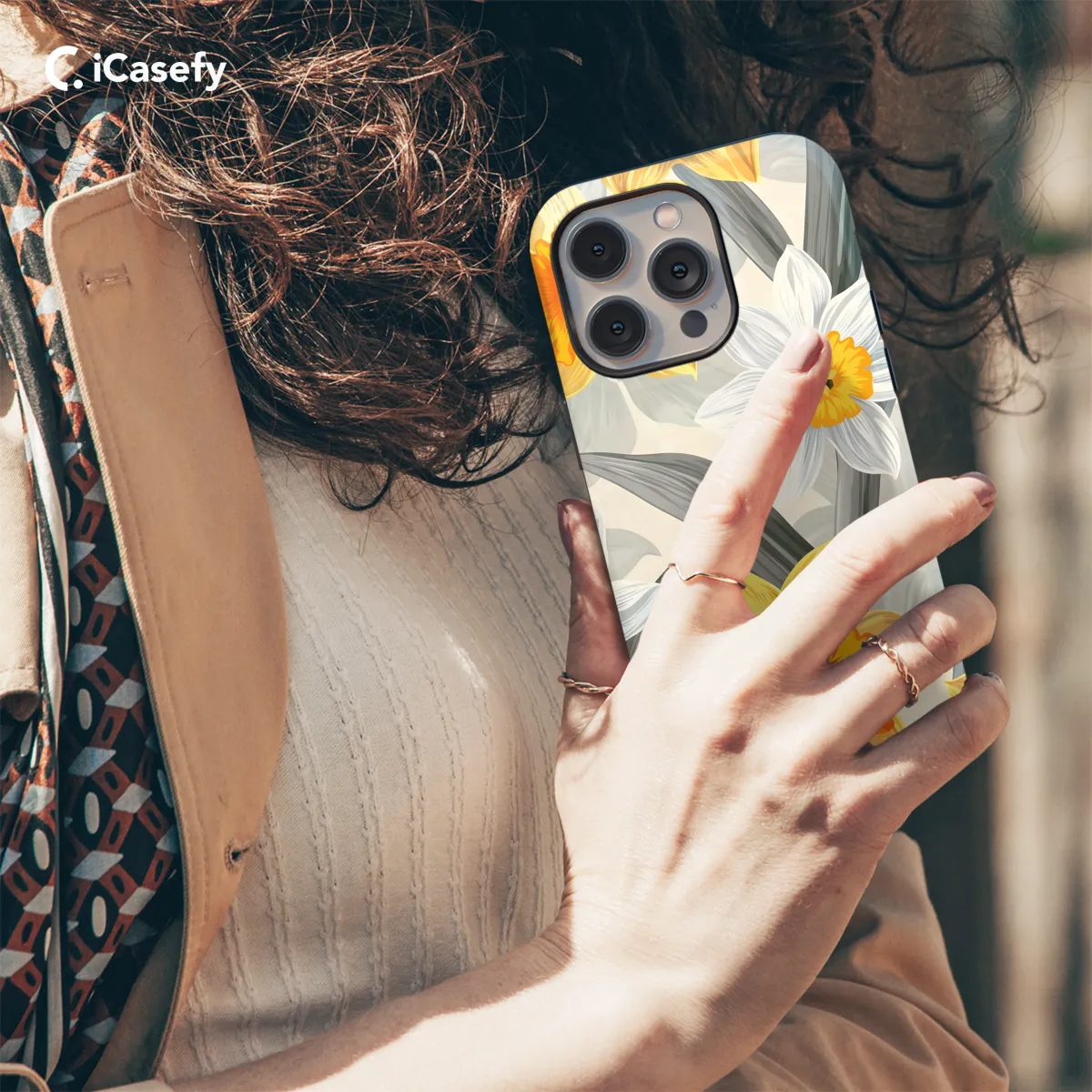 Embrace the vibrant hues of spring with our elegant floral phone case. Adorned with blooming daffodils in golden hues and verdant greenery, this case captures the essence of the season's awakening. Its durable design protects your beloved device while adding a touch of botanical beauty to your daily routine. Available for a wide range of iPhone, Samsung, and Pixel models, this case ensures that your phone blooms with style and protection wherever you go.
