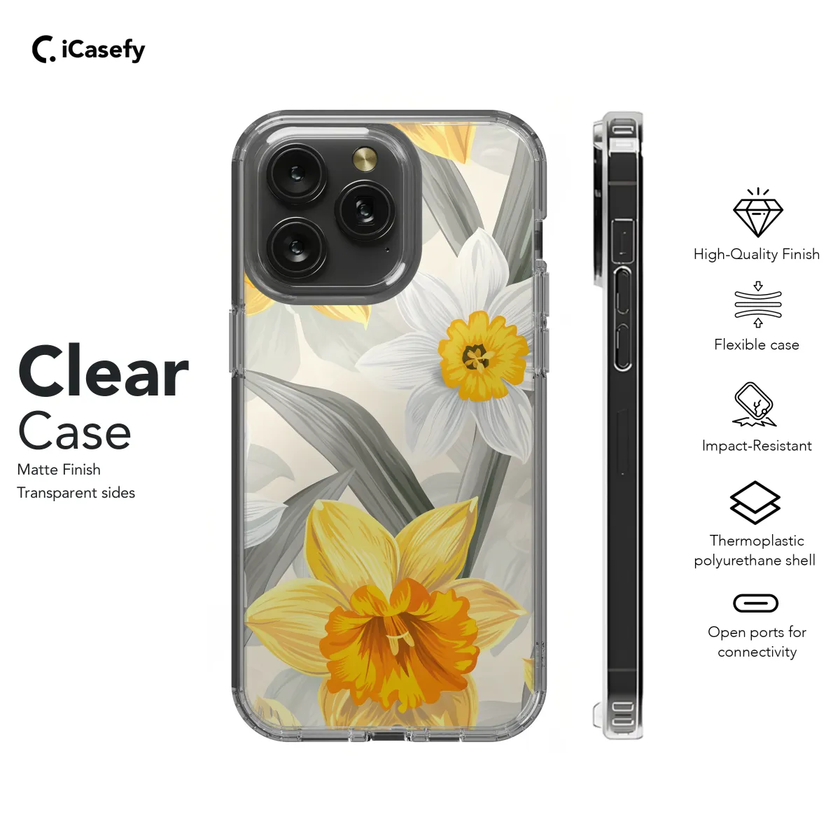 Embrace the vibrant hues of spring with our elegant floral phone case. Adorned with blooming daffodils in golden hues and verdant greenery, this case captures the essence of the season's awakening. Its durable design protects your beloved device while adding a touch of botanical beauty to your daily routine. Available for a wide range of iPhone, Samsung, and Pixel models, this case ensures that your phone blooms with style and protection wherever you go.