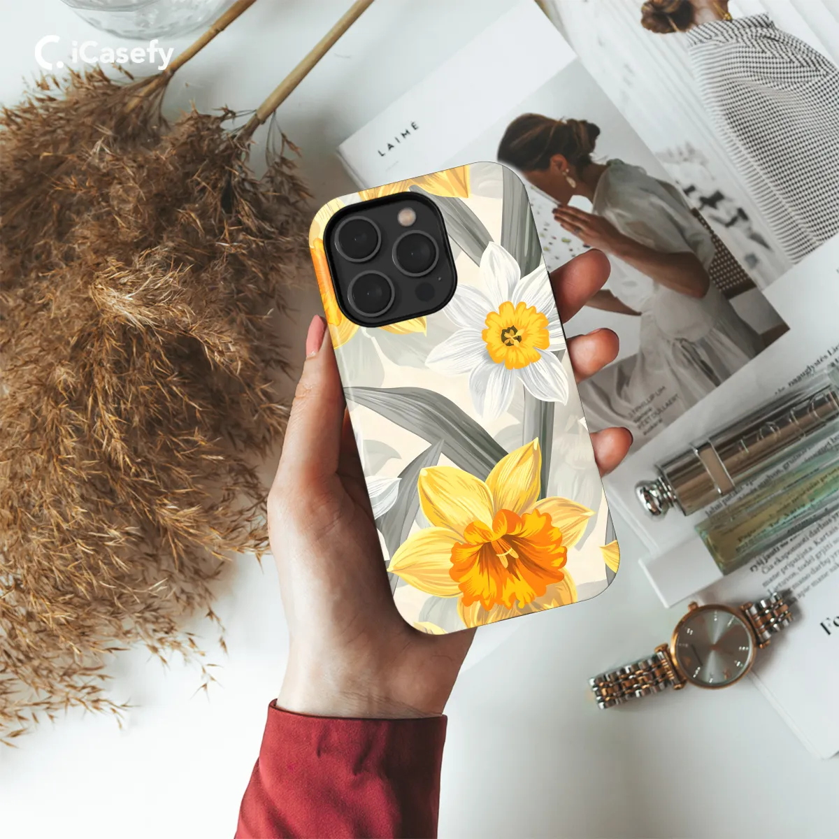 Embrace the vibrant hues of spring with our elegant floral phone case. Adorned with blooming daffodils in golden hues and verdant greenery, this case captures the essence of the season's awakening. Its durable design protects your beloved device while adding a touch of botanical beauty to your daily routine. Available for a wide range of iPhone, Samsung, and Pixel models, this case ensures that your phone blooms with style and protection wherever you go.