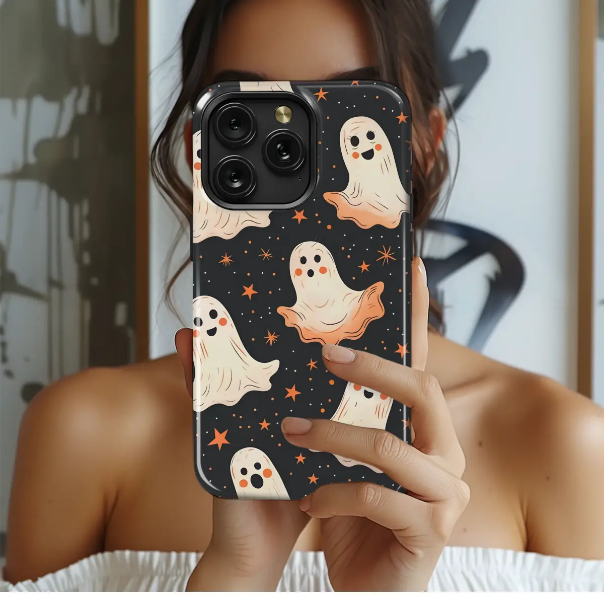 Embrace the enchanting magic of the spooky season with this utterly charming design! Imagine a clear autumn night sky, brought to life as a constellation of friendly ghosts dances across a cosmic canvas. Each little spirit, with its rosy cheeks and impossibly sweet smile, floats serenely amidst a delightful scatter of twinkling orange stars and celestial dust, creating a heartwarming and whimsical spectacle. The design's deep, dark background makes the creamy, ethereal figures pop, giving the artwork a delightful retro storybook feel that evokes a sense of cozy nostalgia. This isn't just a pattern; it's a little pocket of joy and a conversation starter, perfect for anyone who adores a touch of cute gothic charm and the warm vibes of fall. Let this celestial boo crew add a sprinkle of starlight and friendly hauntings to your daily style, transforming your favorite essential into a piece of unique art. It’s the ideal way to celebrate your love for Halloween all year round, or a thoughtful gift for the pastel goth enthusiast, the lover of kawaii aesthetics, or anyone who believes in the magic of a friendly ghost.