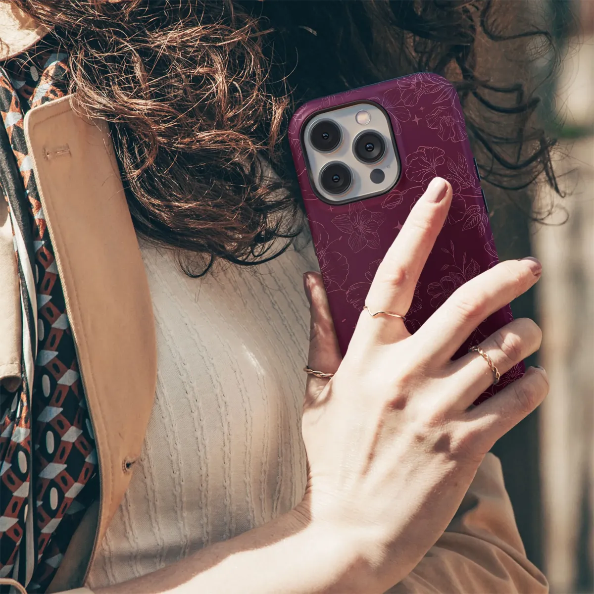 Wrap your tech in the mysterious allure of this exquisite dark botanical design. Featuring a captivating pattern of elegant hand-drawn floral outlines set against a rich, deep wine-red backdrop, this print evokes the enchanting beauty of a secret garden at twilight. Delicate lines trace the contours of various blossoms, from bold hibiscus blooms to intricate smaller flowers and winding vines, interspersed with subtle, shimmering star-like accents that add a touch of magic. The moody burgundy and lighter rose-pink color palette creates a sophisticated and dramatic aesthetic, perfect for those who appreciate gothic romance, dark academia vibes, or simply the timeless charm of nature-inspired art with an edgy twist. This unique botanical print is designed to transform your everyday essentials into stylish statements, adding a touch of personality and artistic flair to your portable companions. It’s an ideal choice for anyone seeking an aesthetic upgrade that combines natural elements with a darkly elegant sensibility. Embrace the beauty of this enchanting pattern, a true conversation starter that reflects a love for intricate detail and captivating design. This versatile design offers a perfect way to showcase your unique style and appreciation for botanical artwork, providing a visually stunning exterior for your essential electronics. The seamless repeat of this captivating floral arrangement ensures a consistent and beautiful look across your chosen surface, making it a perfect fit for anyone desiring a chic and eye-catching accessory with a hint of dark fantasy. Let this beautiful pattern protect and personalize your device with its undeniable charm.