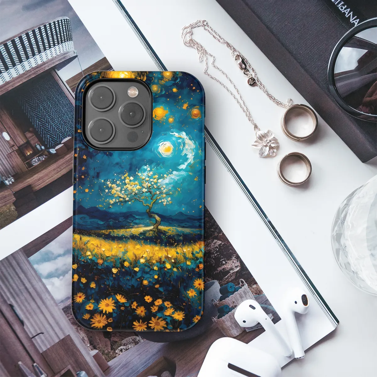 **Starry Night Bloom Phone Case** Escape into a celestial tapestry of colors with our Starry Night Bloom phone case. Inspired by Vincent van Gogh's iconic artwork, this case transports you to a realm of vibrant hues and ethereal brushstrokes. Crafted from durable materials, our case offers superior protection against drops, scratches, and everyday wear. Its slim-fit design complements your phone seamlessly, ensuring both style and functionality. Unleash your artistic spirit and embrace the beauty of the starry night with this enchanting phone case. It's the perfect accessory to transform your device into a portable masterpiece.