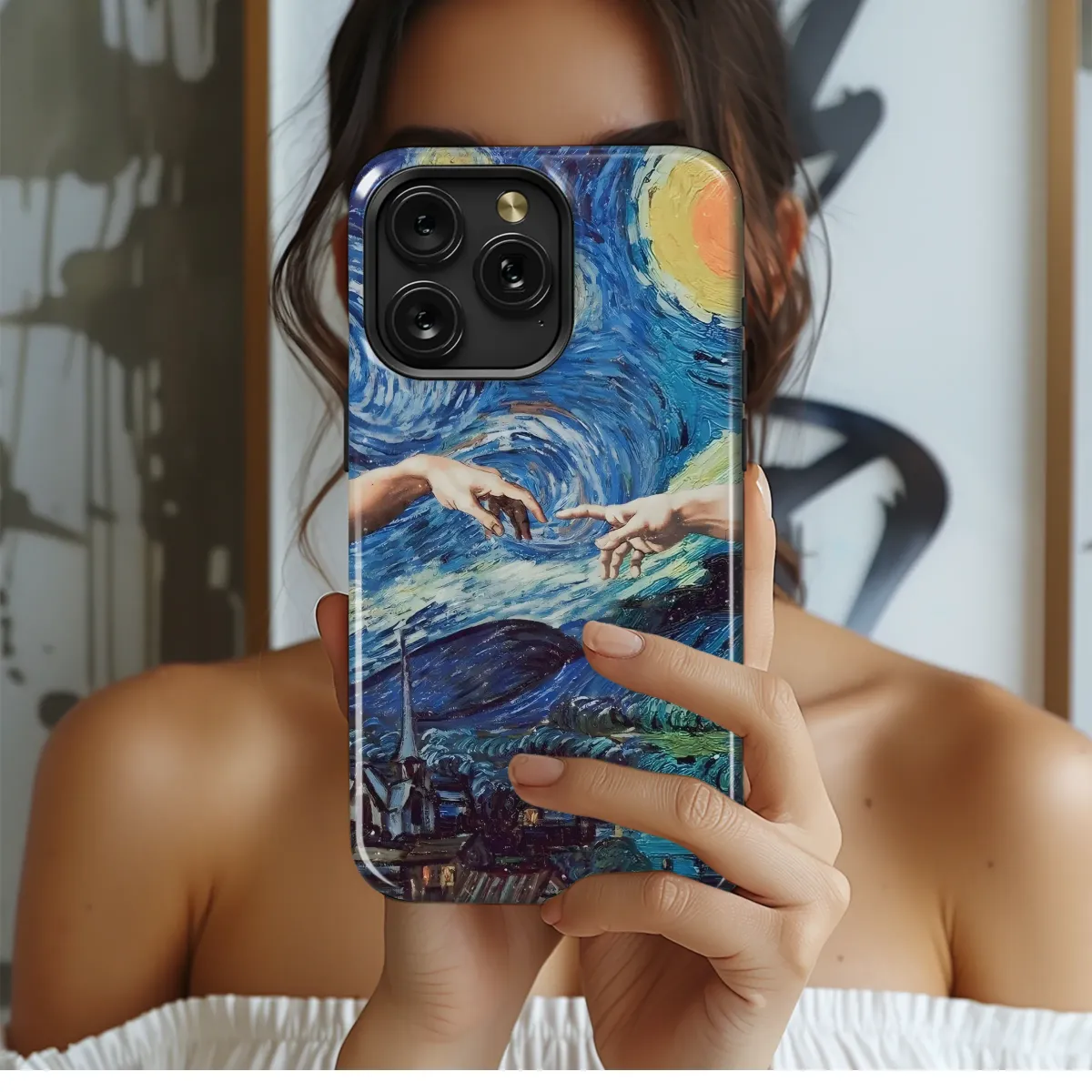 Elevate your style with this captivating artistic design, a mesmerizing fusion of Vincent van Gogh's iconic "The Starry Night" and Michelangelo's "The Creation of Adam." The swirling brushstrokes of the night sky create a breathtaking backdrop for the iconic reaching hands, symbolizing connection and artistic brilliance. This vibrant, high-resolution print transforms your device into a portable masterpiece, showcasing your unique appreciation for art and timeless beauty. Perfect for expressing your individual style, this piece is a conversation starter, guaranteed to turn heads. The rich colors and detailed textures are printed with precision, ensuring a durable and vibrant finish that will withstand daily wear and tear. Add a touch of artistic flair to your everyday life and make a statement that speaks volumes. This design is a tribute to classic art, reimagined for the modern art enthusiast. Its stunning visual appeal pairs perfectly with any aesthetic, blending seamlessly into your personal style. Order yours today and experience the artistry!