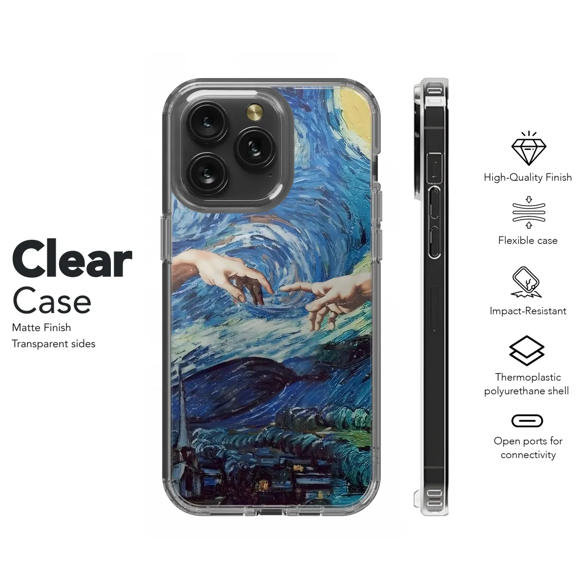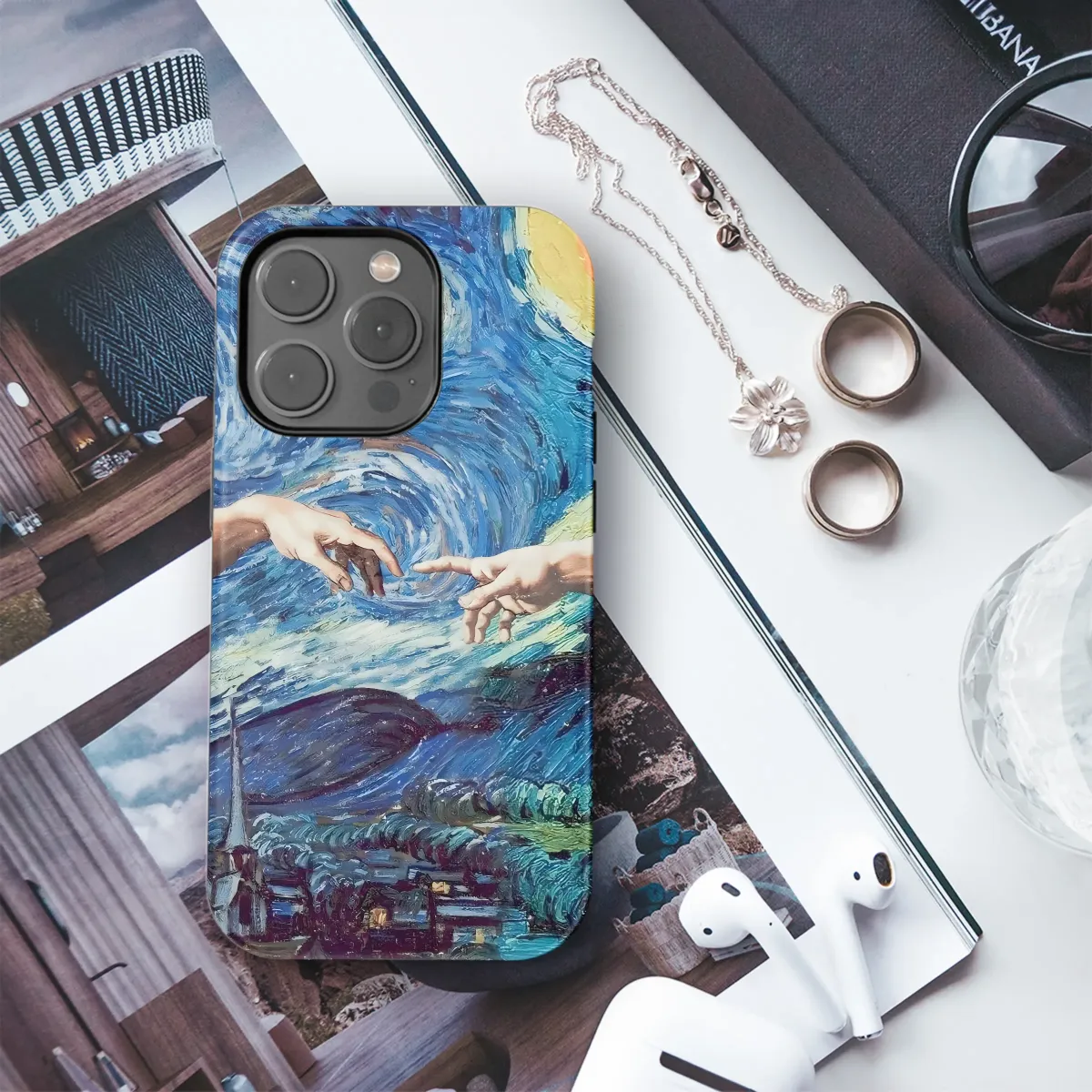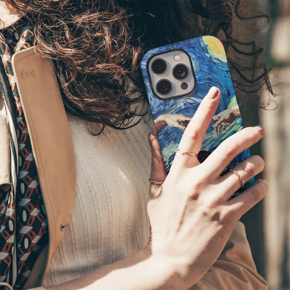 Elevate your style with this captivating artistic design, a mesmerizing fusion of Vincent van Gogh's iconic "The Starry Night" and Michelangelo's "The Creation of Adam." The swirling brushstrokes of the night sky create a breathtaking backdrop for the iconic reaching hands, symbolizing connection and artistic brilliance. This vibrant, high-resolution print transforms your device into a portable masterpiece, showcasing your unique appreciation for art and timeless beauty. Perfect for expressing your individual style, this piece is a conversation starter, guaranteed to turn heads. The rich colors and detailed textures are printed with precision, ensuring a durable and vibrant finish that will withstand daily wear and tear. Add a touch of artistic flair to your everyday life and make a statement that speaks volumes. This design is a tribute to classic art, reimagined for the modern art enthusiast. Its stunning visual appeal pairs perfectly with any aesthetic, blending seamlessly into your personal style. Order yours today and experience the artistry!