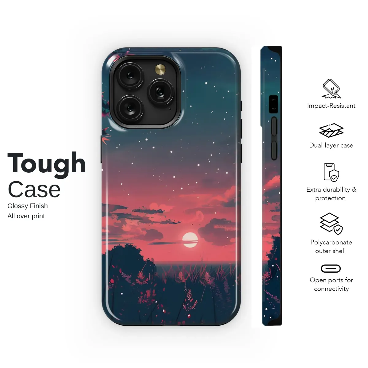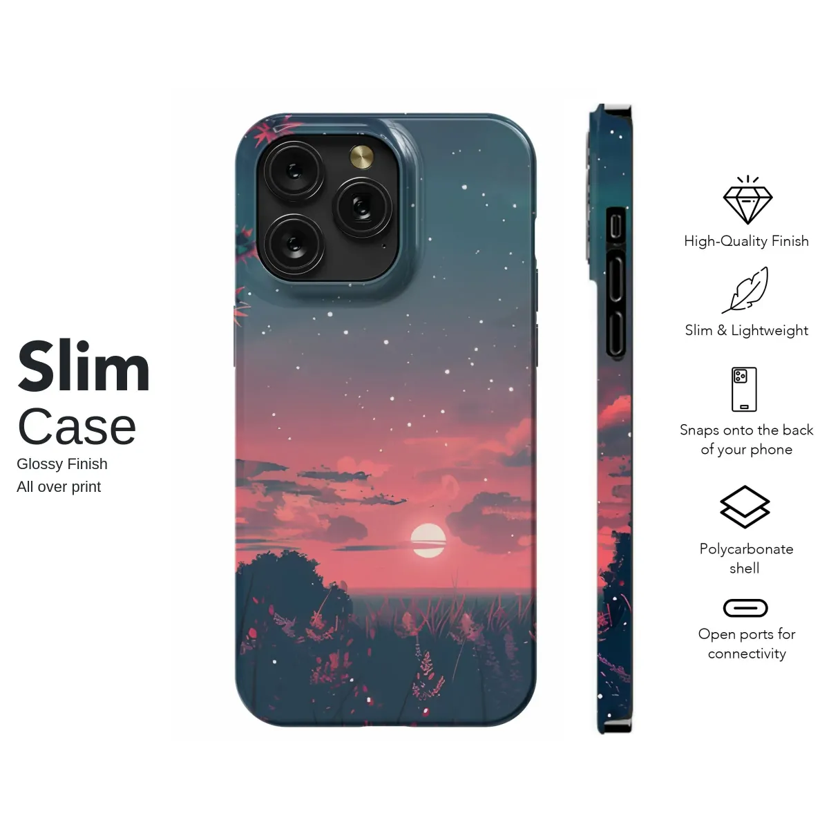 Immerse yourself in a breathtaking twilight landscape, captured in exquisite anime artistry. This stunning illustration transports you to a serene realm where vibrant hues paint the sky in shades of breathtaking pink and deep purple, dissolving into a rich, starry blue above. The celestial display features countless twinkling stars scattered across the vast expanse, complementing the soft, glowing orb near the horizon, suggesting either a magical sunset or a serene dawn breaking over a tranquil body of water. Silhouetted trees with intricate foliage gracefully frame the scene, creating a sense of depth and mystery, while delicate foreground plants add texture and a touch of natural beauty, illuminated by soft, ethereal light. Wispy, colorful clouds drift lazily, enhancing the dreamlike atmosphere of this captivating digital painting. Perfect for those who appreciate fantasy landscapes, celestial aesthetics, and the enchanting world of Japanese illustration, this design evokes powerful feelings of peace, wonder, and nostalgic beauty. Bring a piece of this atmospheric, star-filled moment into your everyday life with this vibrant, illustrated print. It's an ideal way to carry a glimpse of a magical, starry sky and a captivating, colorful panorama wherever you go, adding a unique touch of artistic flair and tranquil charm to your belongings. This detailed artwork showcases a captivating blend of natural elements and fantastical color, creating a truly mesmerizing visual experience that stands out.