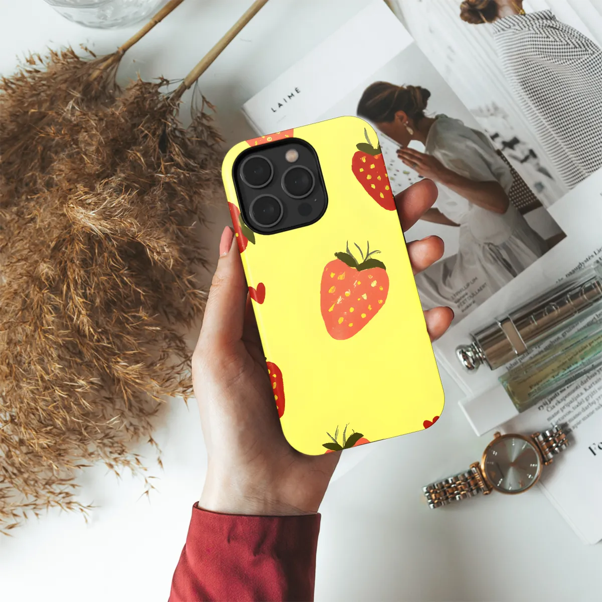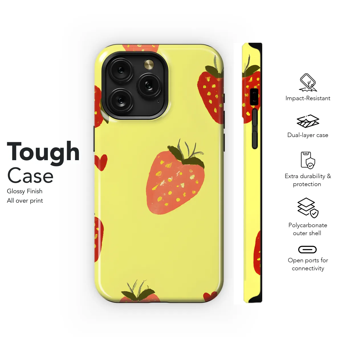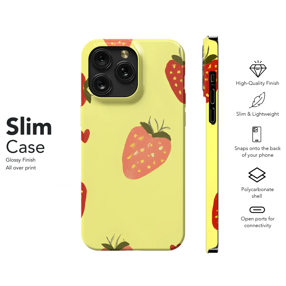 Slide into summer with our vibrant Strawberry Yellow Phone Case, the perfect accessory to keep your device protected and stylish. This eye-catching cover is compatible with a wide range of iPhone, Samsung, and Pixel models, ensuring a snug fit for your precious phone. Crafted from durable materials, it shields your device from scratches, bumps, and everyday wear and tear.
