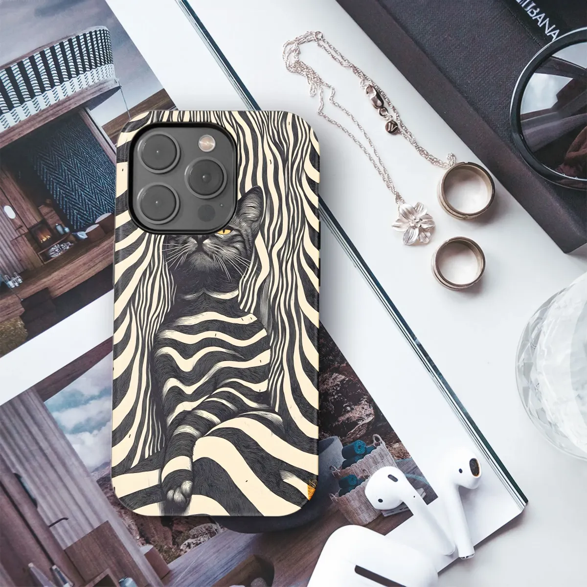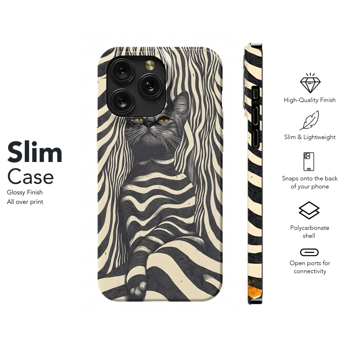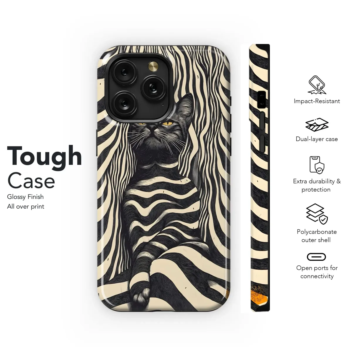 Dreamy stripes meet feline charm in this protective phone case. Available for iPhone, Samsung, and Pixel. Get yours today!