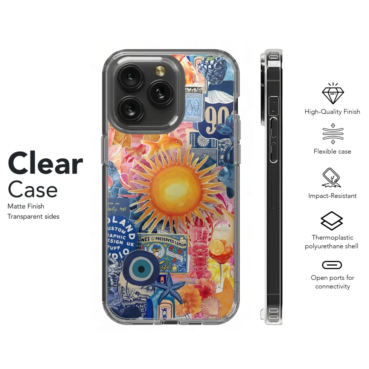 Elevate your tech with this vibrant collage, a visual explosion of summer vibes and eclectic charm. Featuring a sun-soaked palette of oranges, blues, and pinks, this captivating design showcases playful illustrations of marine life like goldfish and starfish, juxtaposed with iconic imagery like a vintage car, refreshing fruits such as papaya and orange slices, and unique elements like an evil eye talisman and a bottle of Bombay Sapphire. "Somewhere in Northern Italy, 1983" adds a touch of retro wanderlust, while elements like "Midland Custom Graphic Design" and "Preserved Lemons" inject a dose of quirky personality. Perfect for those who love bold, eye-catching designs, this artwork brings a touch of sunshine and whimsy to your everyday carry. Ideal for art lovers, travel enthusiasts, and anyone seeking a unique statement piece, this stunning artwork is sure to turn heads and spark conversation. Get your hands on this beautiful design now and transform your devices with this unique and colorful aesthetic!
