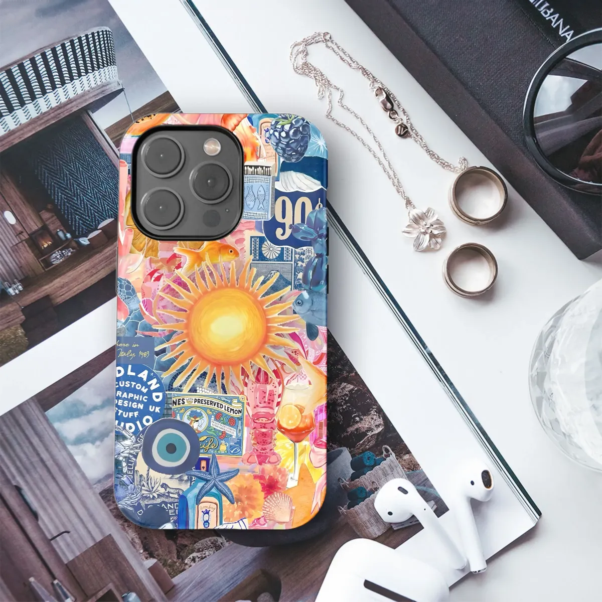 Elevate your tech with this vibrant collage, a visual explosion of summer vibes and eclectic charm. Featuring a sun-soaked palette of oranges, blues, and pinks, this captivating design showcases playful illustrations of marine life like goldfish and starfish, juxtaposed with iconic imagery like a vintage car, refreshing fruits such as papaya and orange slices, and unique elements like an evil eye talisman and a bottle of Bombay Sapphire. "Somewhere in Northern Italy, 1983" adds a touch of retro wanderlust, while elements like "Midland Custom Graphic Design" and "Preserved Lemons" inject a dose of quirky personality. Perfect for those who love bold, eye-catching designs, this artwork brings a touch of sunshine and whimsy to your everyday carry. Ideal for art lovers, travel enthusiasts, and anyone seeking a unique statement piece, this stunning artwork is sure to turn heads and spark conversation. Get your hands on this beautiful design now and transform your devices with this unique and colorful aesthetic!