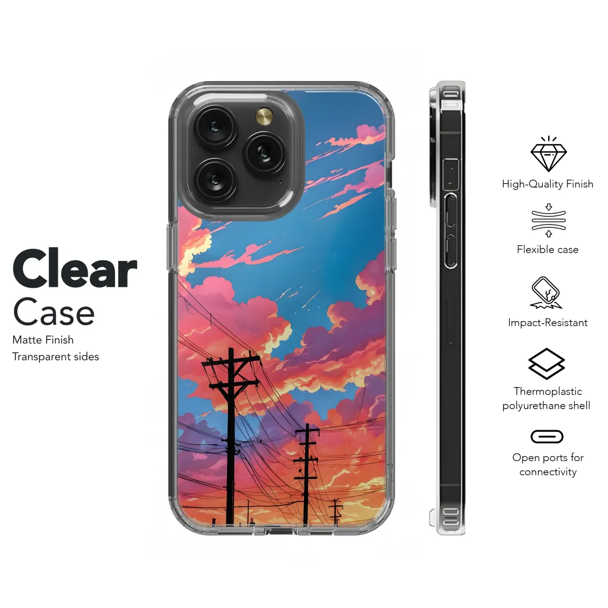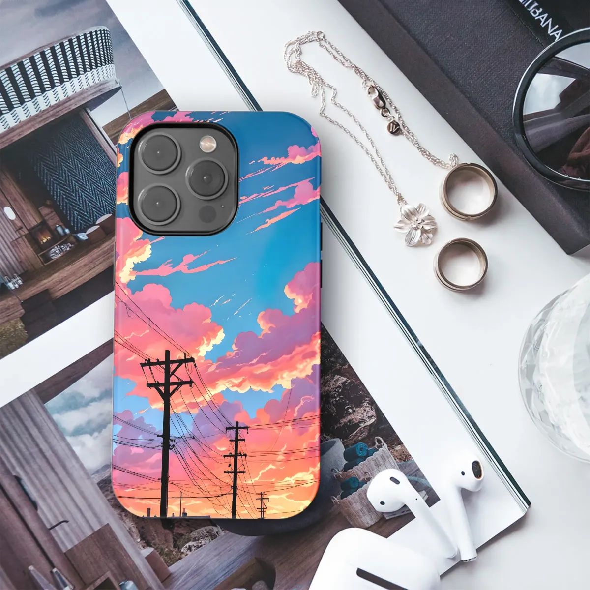 Adorn your device with this captivating sunset cityscape design. Vibrant hues of pink and orange paint the sky, creating a dreamy, almost surreal atmosphere. Silhouetted power lines stretch across the scene, leading the eye towards a glowing sunset over a quiet residential street. This artwork evokes feelings of warmth, tranquility, and nostalgic charm, making it a perfect choice for those who appreciate artistic expression and unique designs. The high-resolution print ensures crisp, vibrant colors that will last. This striking image is sure to turn heads and spark conversations, adding a touch of artistic flair to your daily life. It's more than just a cover; it's a statement. Transform your everyday accessory into a miniature work of art that reflects your personal style and appreciation for beautiful, evocative imagery. Perfect as a gift or a self-treat, this design brings a piece of artistic sunset serenity wherever you go. Shop now and add a touch of magic to your world!