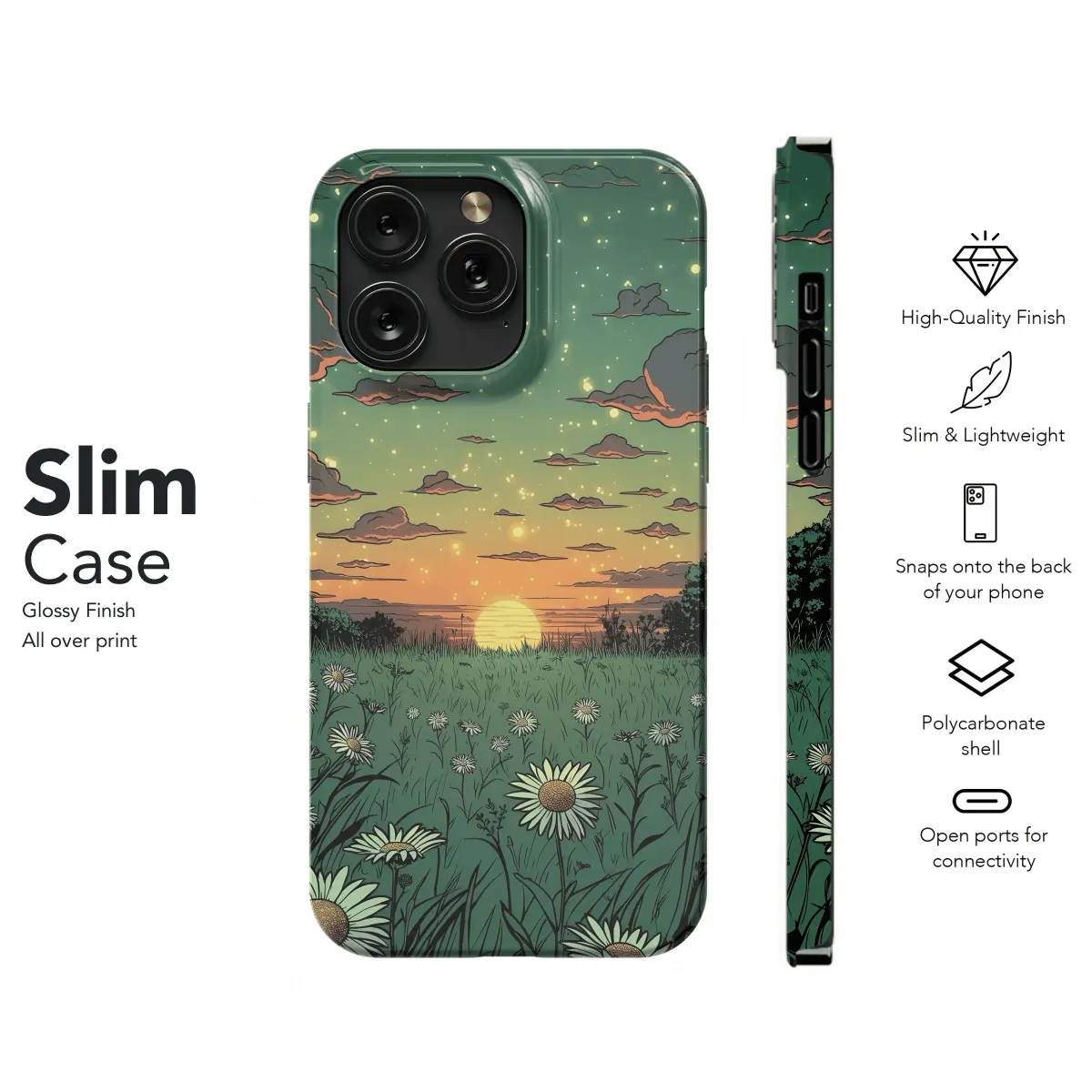 Escape into the serene beauty of nature with our Sunset Daisies Field phone case. This captivating design features a vibrant meadow awash in golden hour hues, where delicate daisies dance in the gentle breeze. The intricate details and rich colors will transport you to a tranquil haven, reminding you of the simple joys of life.