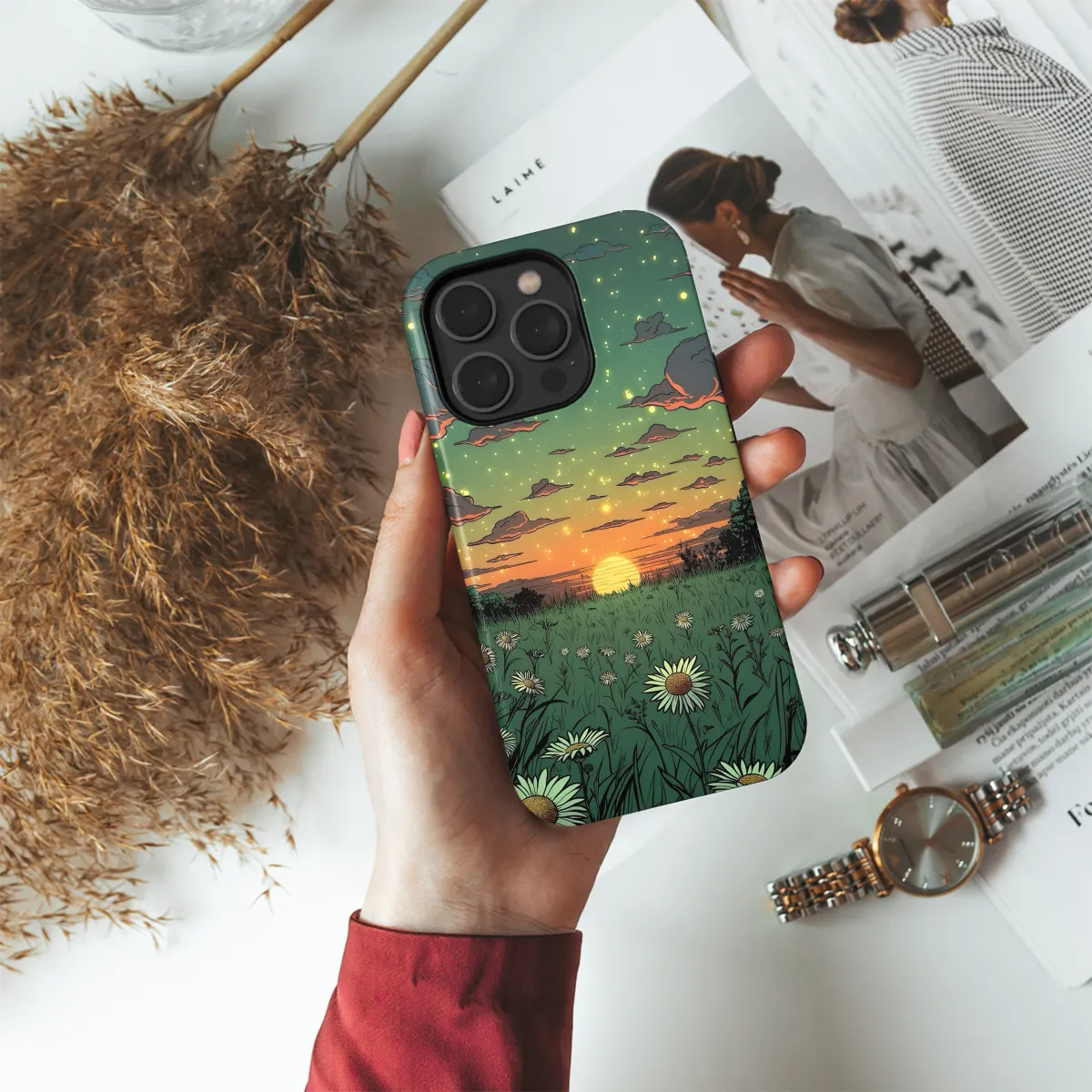 Escape into the serene beauty of the Sunset Meadow with this ethereal phone case. The mesmerizing dreamscape, printed on a durable and protective cover, transports you to a tranquil oasis where hues of orange, pink, and purple blend seamlessly. Each stroke captures the essence of a breathtaking sunset, inviting you to lose yourself in its enchanting allure. Whether you're capturing moments or immersing yourself in the digital world, this case will elevate your phone experience with its captivating design and unwavering protection.