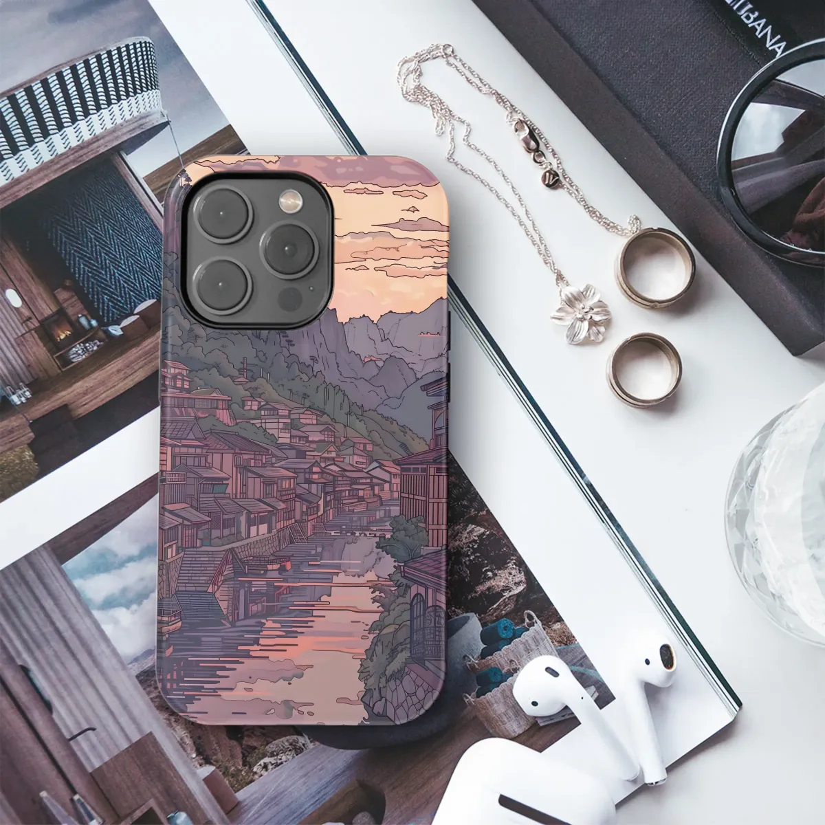 Embrace the serene beauty of a tranquil sunset over a picturesque village nestled in the mountains. This captivating design, rendered in a stunning blend of muted purples, soft pinks, and deep greens, captures the essence of tranquility and wonder. The detailed illustration showcases charming architecture, reflecting the calm waters of a river that winds its way through the heart of the village. A soft, romantic glow from the setting sun bathes the scene in a magical atmosphere, creating a piece that is both artistic and evocative. This high-quality print is perfect for adding a touch of understated elegance and peaceful sophistication to your personal style, making it a perfect gift for yourself or a loved one who appreciates artistic beauty and moments of calm reflection. This unique artwork is sure to be a conversation starter, showcasing your appreciation for artful designs and exquisite detail. The vibrant colors and intricate details are digitally printed for superior clarity and durability, ensuring your design remains a visual masterpiece for years to come. Add a touch of artistic flair to your everyday life with this beautiful piece of wearable art. #sunset #village #mountain #art #illustration #aesthetic #peaceful #tranquil #japanesestyle #unique #gift #wearableart #design #custom #printed #highquality