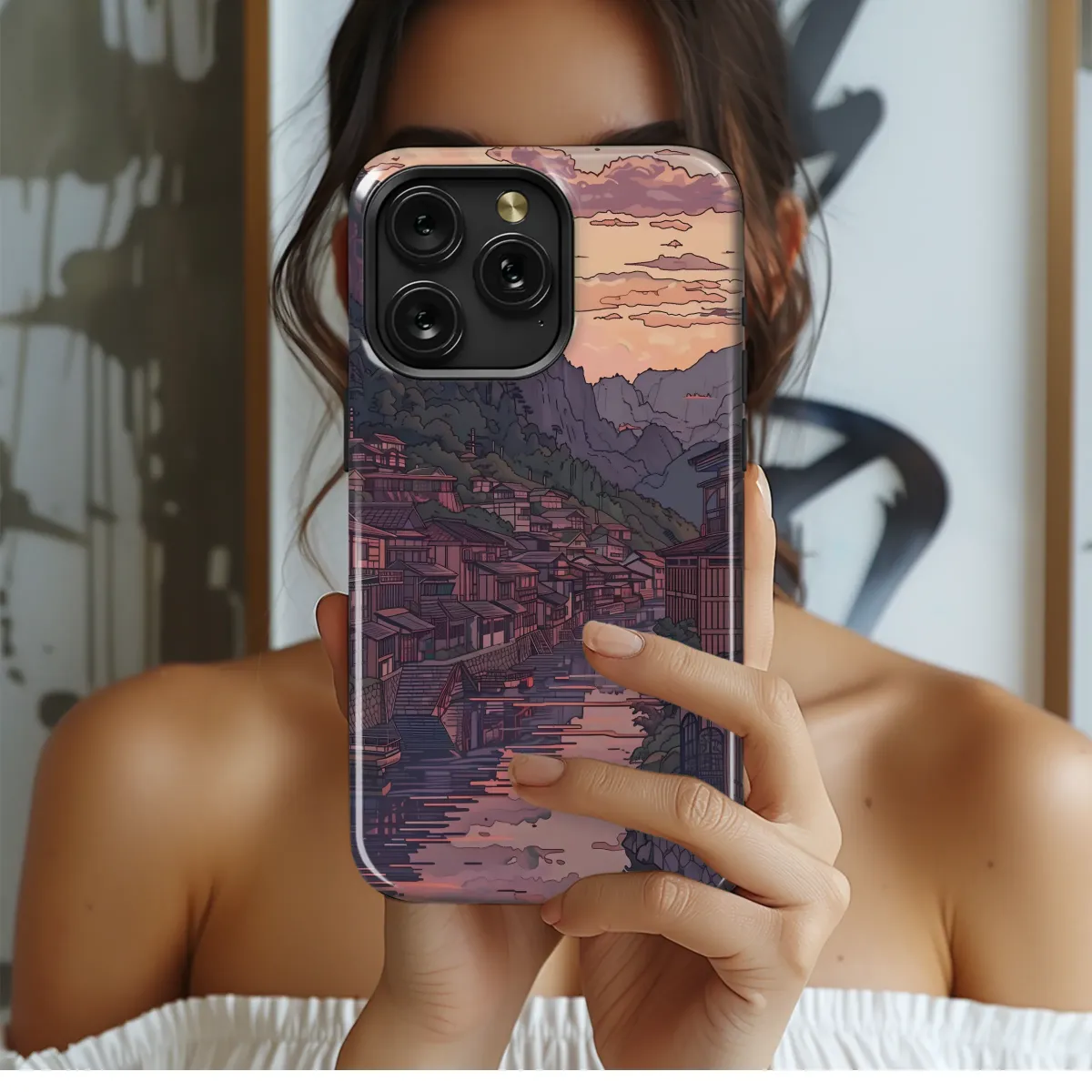 Embrace the serene beauty of a tranquil sunset over a picturesque village nestled in the mountains. This captivating design, rendered in a stunning blend of muted purples, soft pinks, and deep greens, captures the essence of tranquility and wonder. The detailed illustration showcases charming architecture, reflecting the calm waters of a river that winds its way through the heart of the village. A soft, romantic glow from the setting sun bathes the scene in a magical atmosphere, creating a piece that is both artistic and evocative. This high-quality print is perfect for adding a touch of understated elegance and peaceful sophistication to your personal style, making it a perfect gift for yourself or a loved one who appreciates artistic beauty and moments of calm reflection. This unique artwork is sure to be a conversation starter, showcasing your appreciation for artful designs and exquisite detail. The vibrant colors and intricate details are digitally printed for superior clarity and durability, ensuring your design remains a visual masterpiece for years to come. Add a touch of artistic flair to your everyday life with this beautiful piece of wearable art. #sunset #village #mountain #art #illustration #aesthetic #peaceful #tranquil #japanesestyle #unique #gift #wearableart #design #custom #printed #highquality